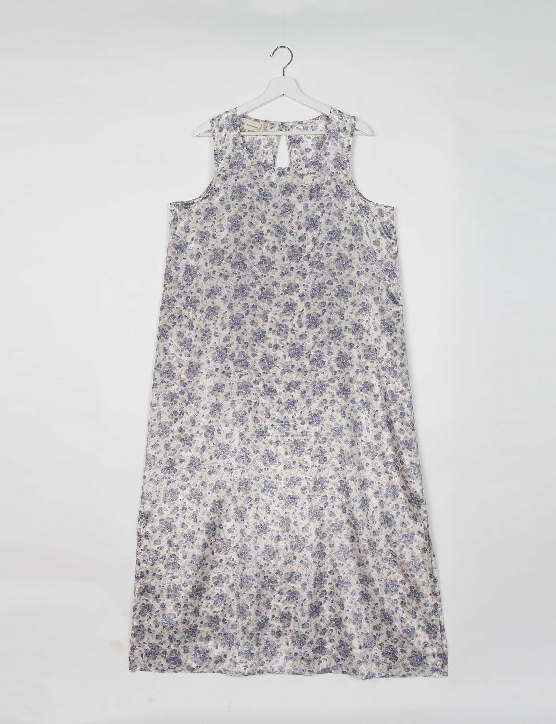 This is a sleeveless A-line maxi dress featuring a round neckline and a full-length silhouette that widens gradually from the shoulders to the hem. It includes a keyhole opening at the back neckline secured with a loop and button closure.