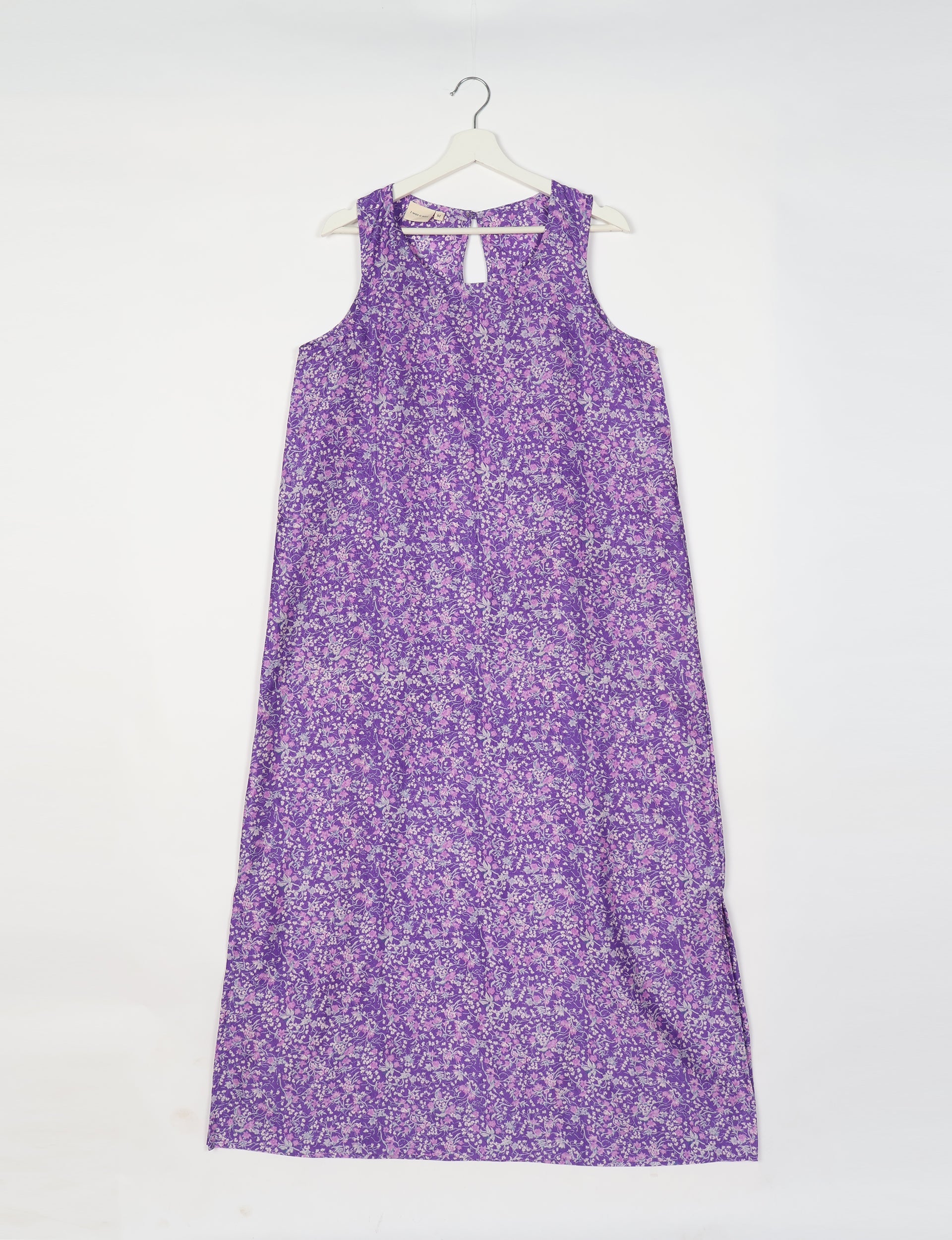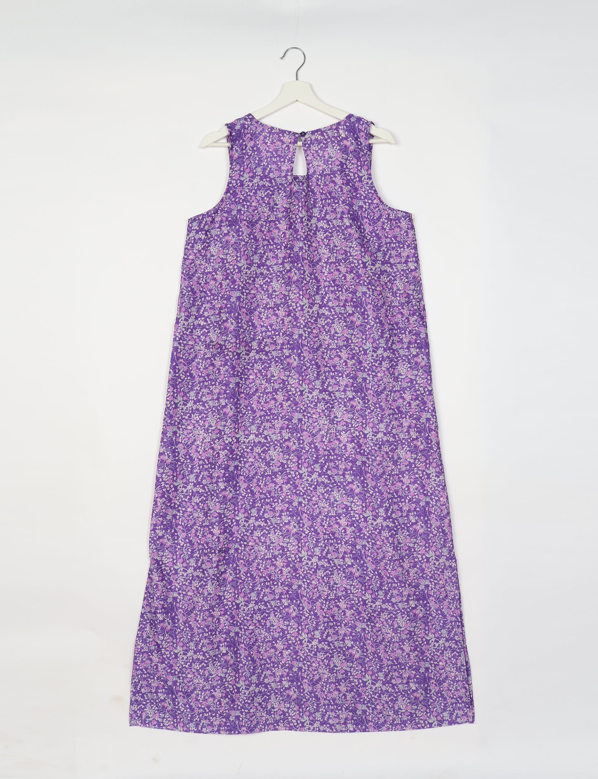 This is a sleeveless A-line maxi dress featuring a round neckline and a full-length silhouette that widens gradually from the shoulders to the hem. It includes a keyhole opening at the back neckline secured with a loop and button closure.