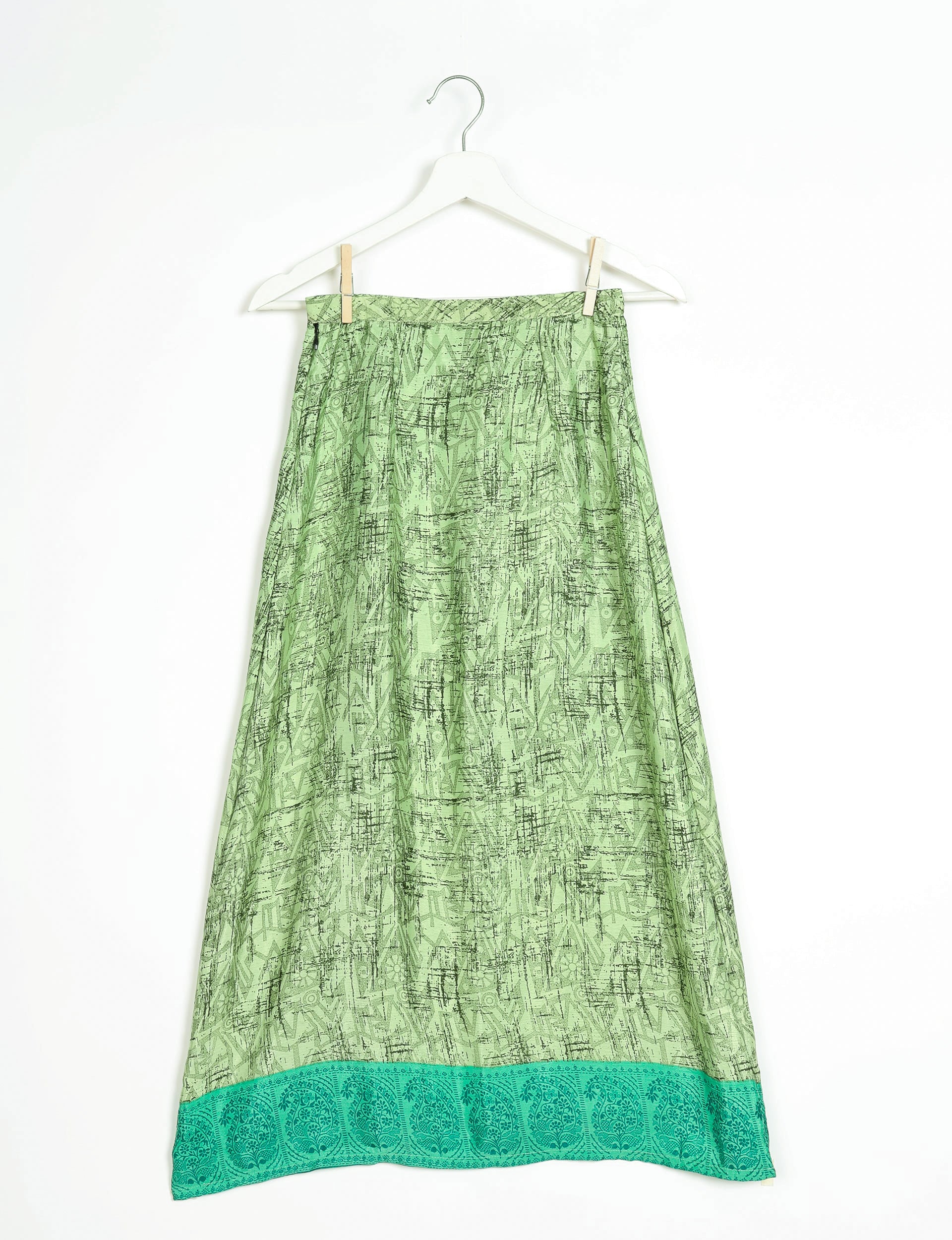 This is a mid-to-ankle length A-line skirt featuring a fitted waistband and flared silhouette. The waistband includes an elasticated back for ease and comfort, while the front remains flat for a clean finish with a button closure.