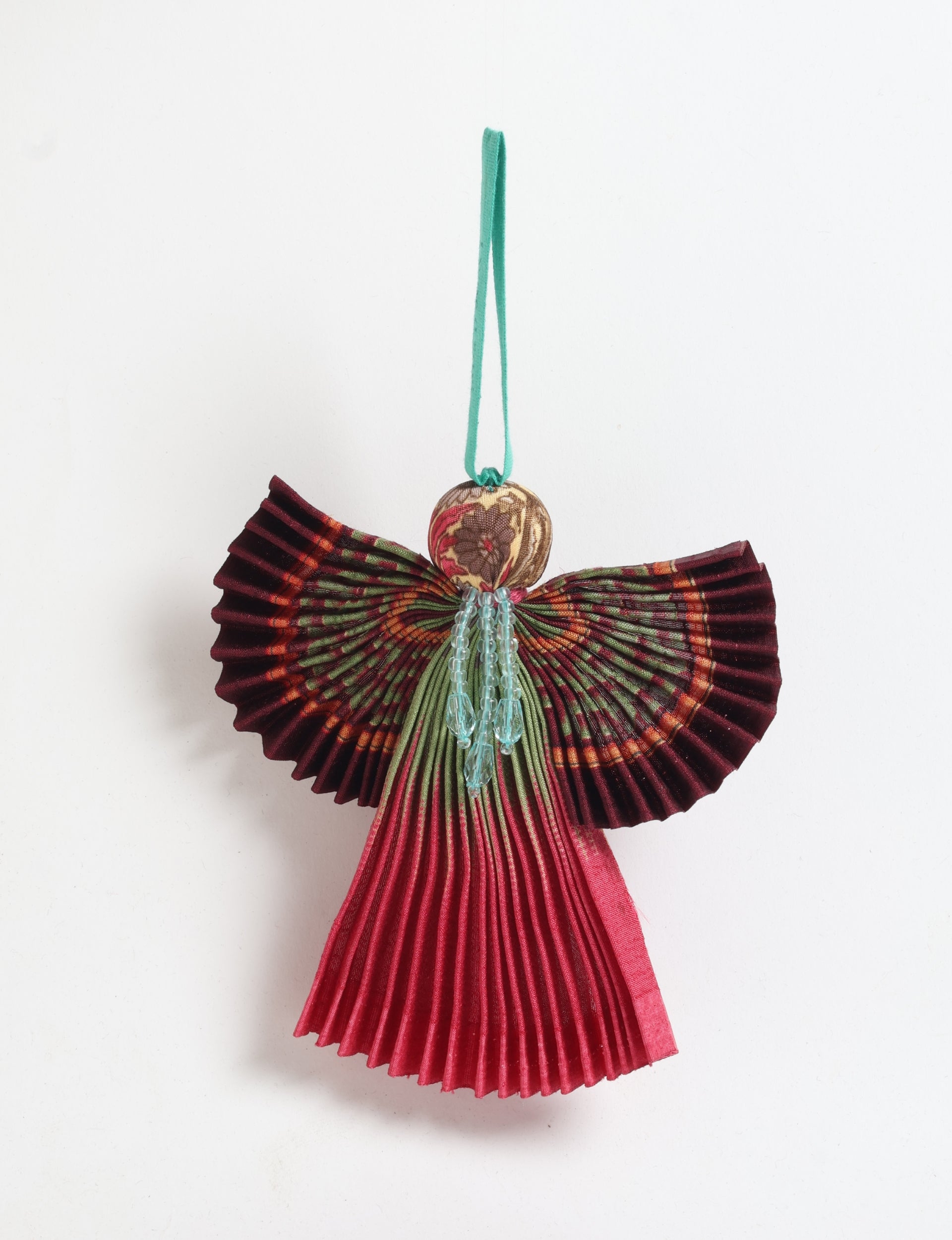 A handcrafted hanging ornament in the shape of an angel. It features pleated wings and a flared body with bead embellishment. Designed with a loop for easy hanging on a Christmas tree or festive décor.