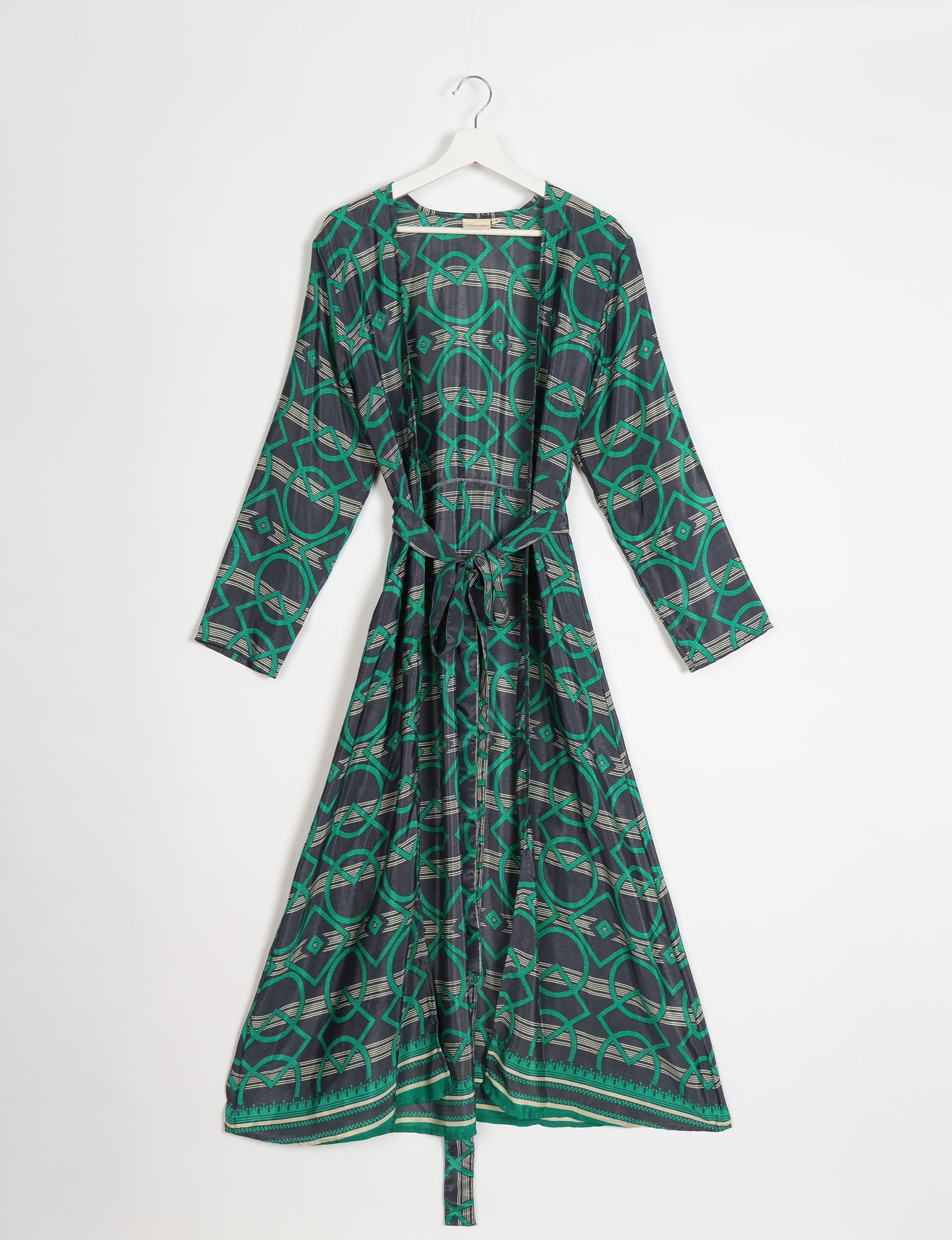 Full-length robe with a tie-up belt. Designed with long sleeves and a straight hem.