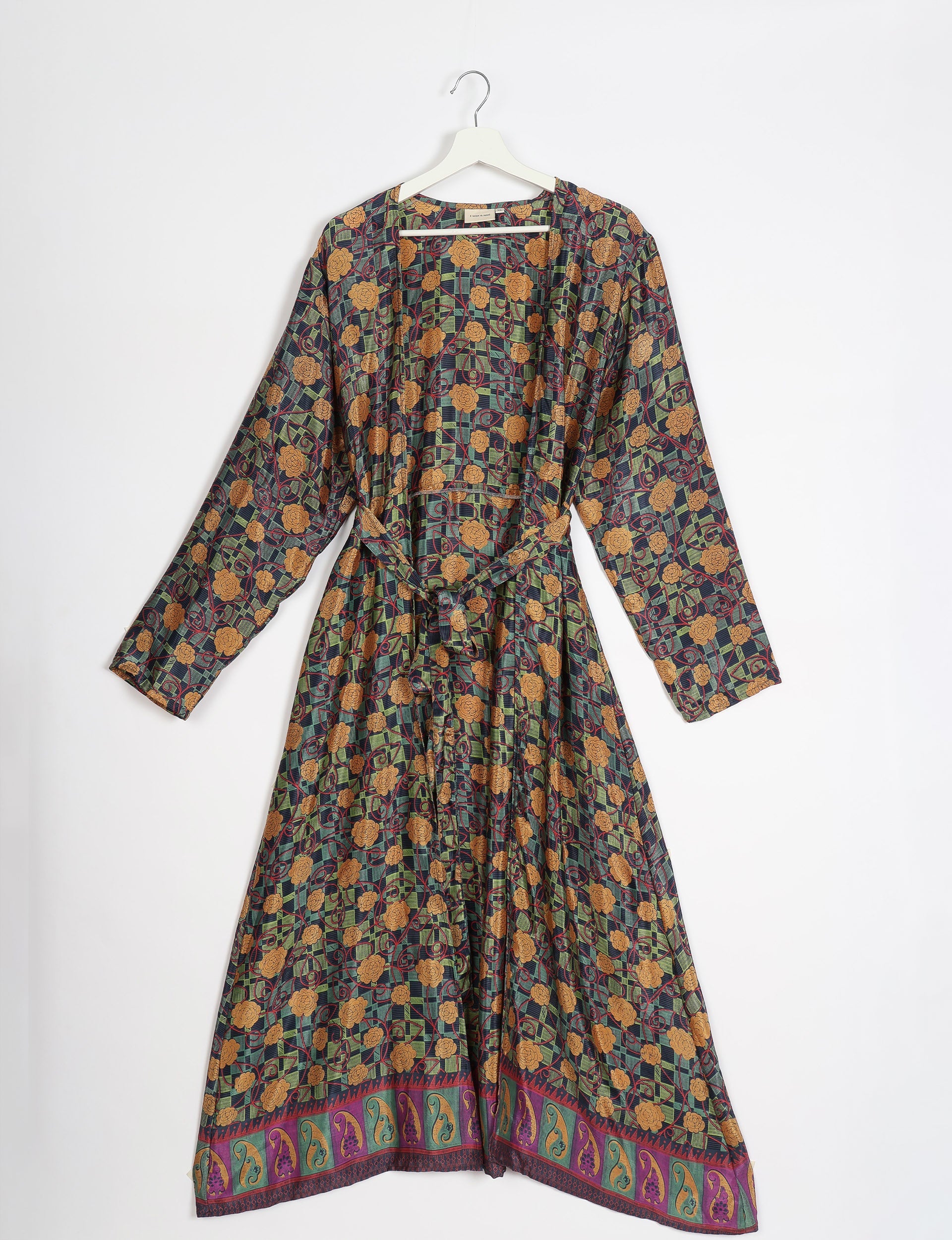 Full-length robe with a tie-up belt. Designed with long sleeves and a straight hem.