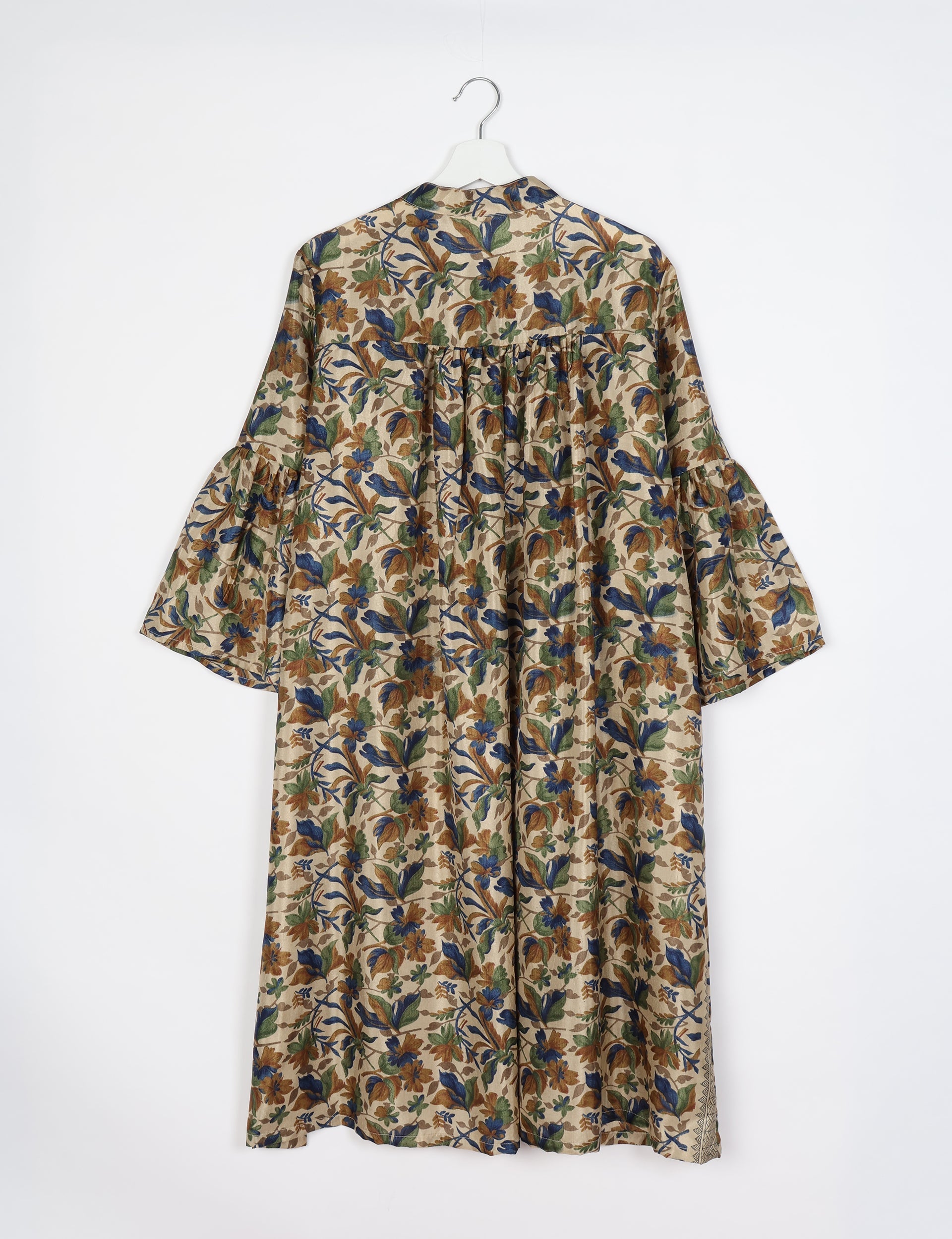 Lightweight long coat with structured bell sleeves. Designed with a round neckline with a stand up collar, front button closure till mid-thigh, and a straight hem. The sleeves have a gathered flare at the cuff and the back has gathers below the yoke for added room.