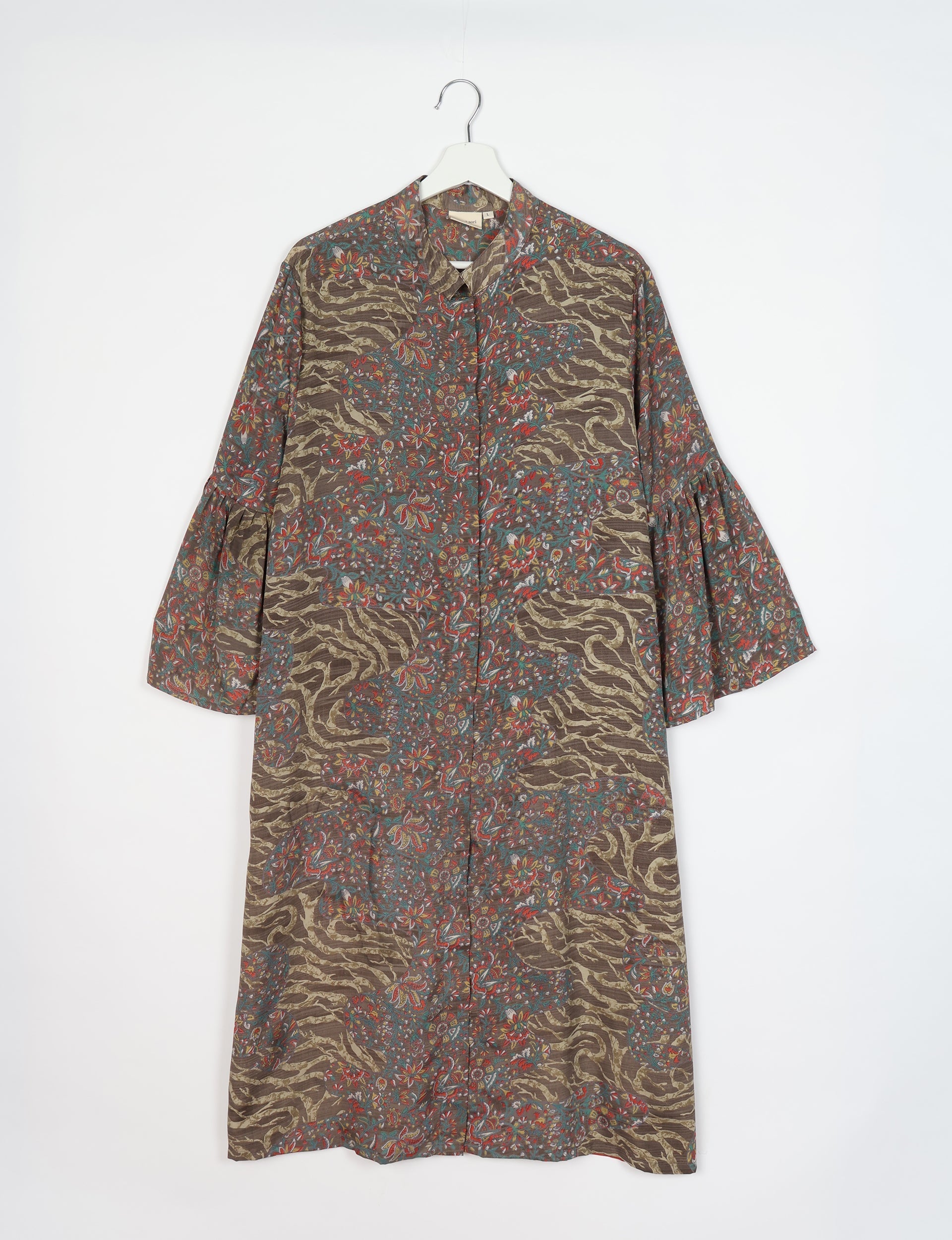 Lightweight long coat with structured bell sleeves. Designed with a round neckline with a stand up collar, front button closure till mid-thigh, and a straight hem. The sleeves have a gathered flare at the cuff and the back has gathers below the yoke for added room.