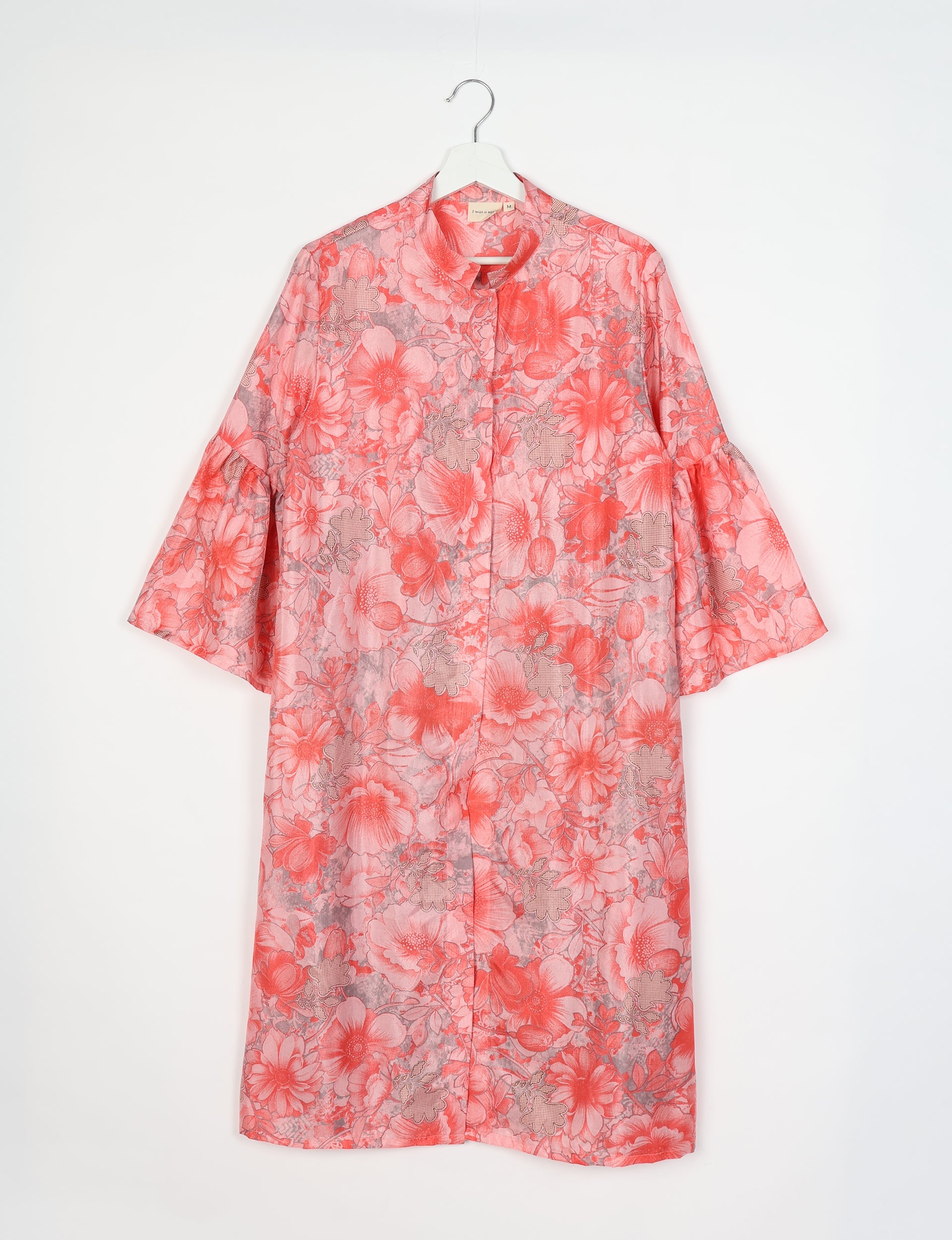 Lightweight long coat with structured bell sleeves. Designed with a round neckline with a stand up collar, front button closure till mid-thigh, and a straight hem. The sleeves have a gathered flare at the cuff and the back has gathers below the yoke for added room.