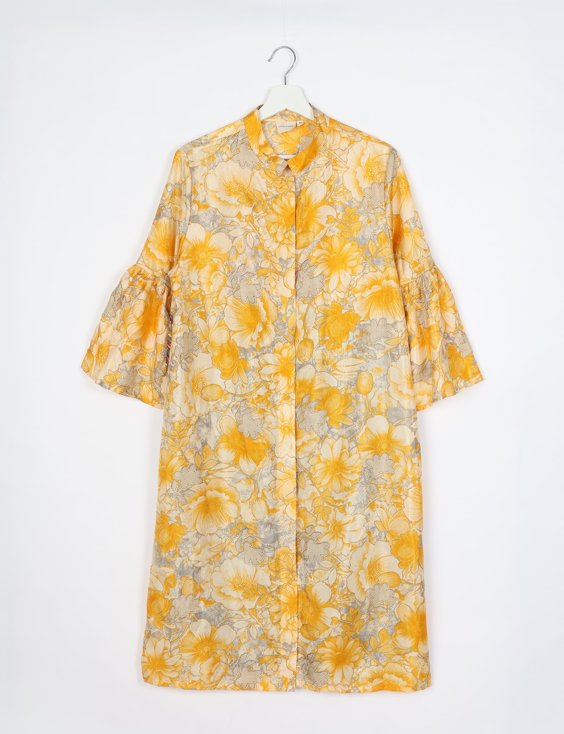 Lightweight long coat with structured bell sleeves. Designed with a round neckline with a stand up collar, front button closure till mid-thigh, and a straight hem. The sleeves have a gathered flare at the cuff and the back has gathers below the yoke for added room.