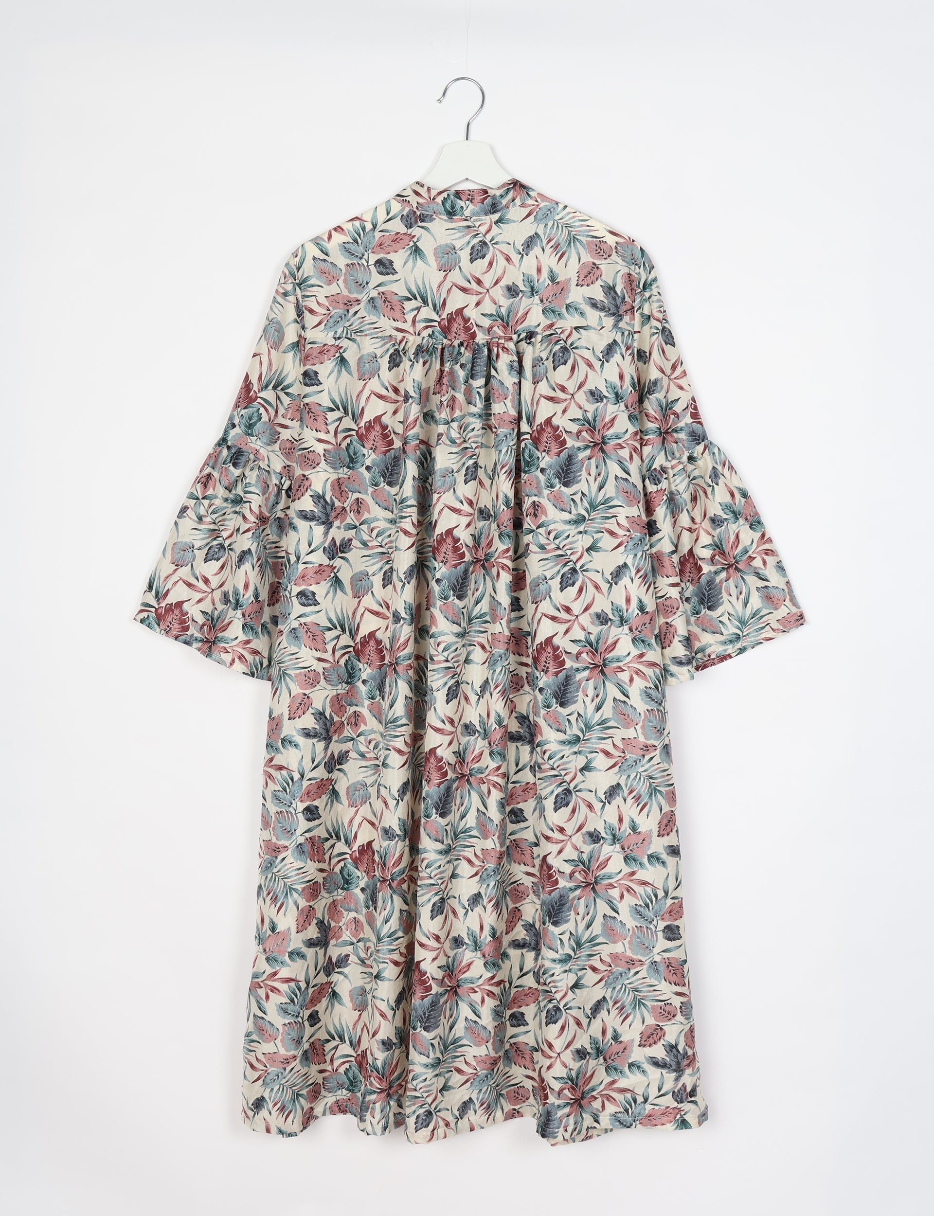 Lightweight long coat with structured bell sleeves. Designed with a round neckline with a stand up collar, front button closure till mid-thigh, and a straight hem. The sleeves have a gathered flare at the cuff and the back has gathers below the yoke for added room.