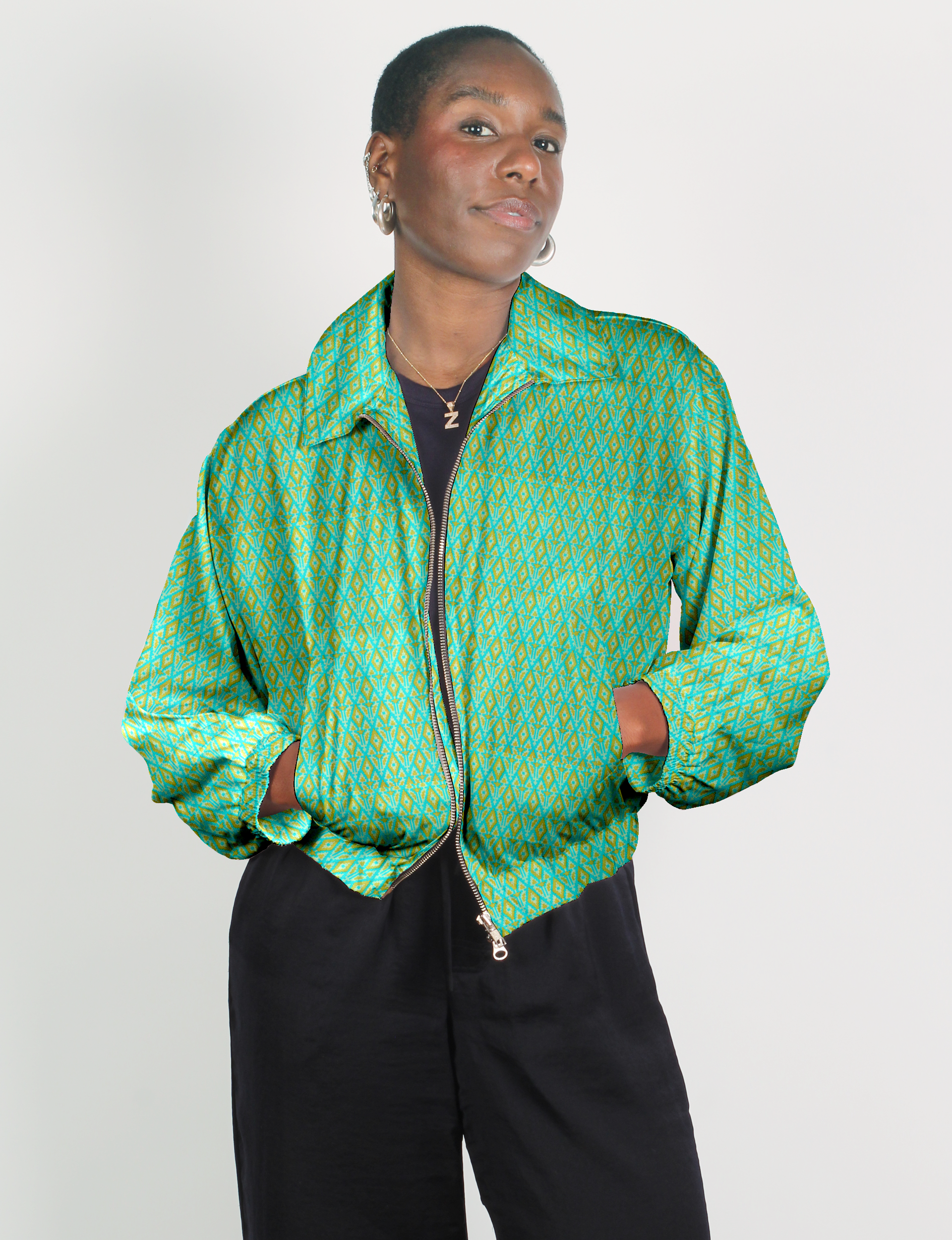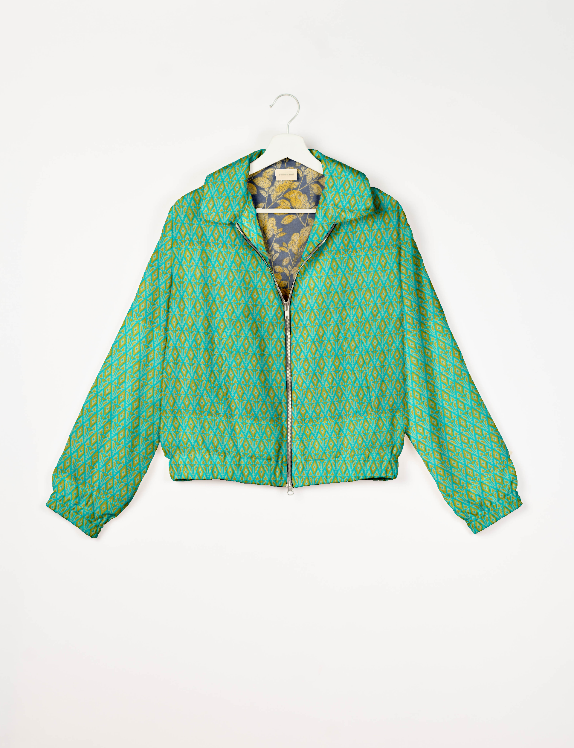 Our Bomber jacket is an iconic wardrobe essential! This military classic features a cropped shape, with elasticated bottom, hem and cuffs. It comes with 2 welt pockets and twin metallic zippers down the front. Also comes with contrast sari print lining and collar flip. Perfect layer for spring days, cool evenings, or air-conditioned workspaces without weighing you down.