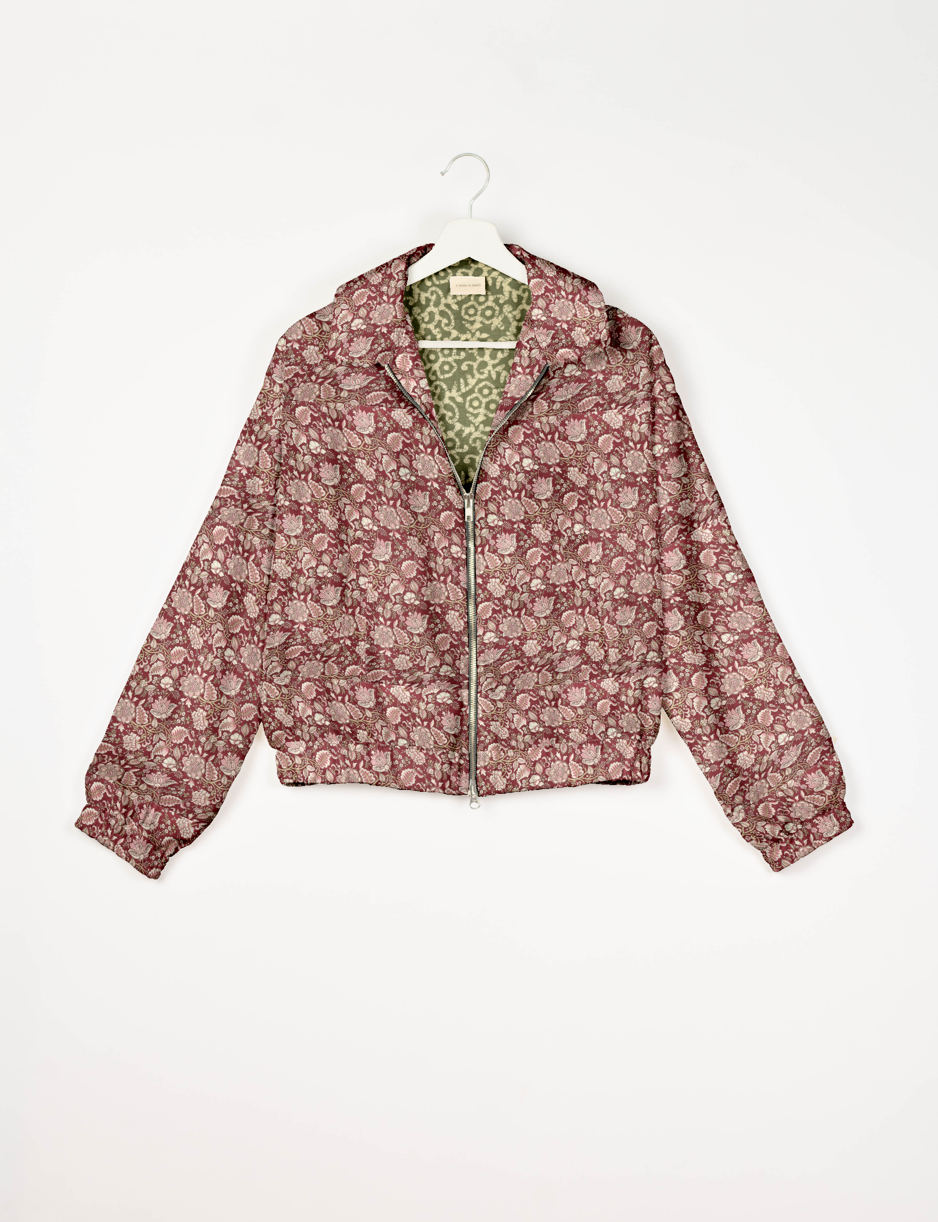 Our Bomber jacket is an iconic wardrobe essential! This military classic features a cropped shape, with elasticated bottom, hem and cuffs. It comes with 2 welt pockets and twin metallic zippers down the front. Also comes with contrast sari print lining and collar flip. Perfect layer for spring days, cool evenings, or air-conditioned workspaces without weighing you down.