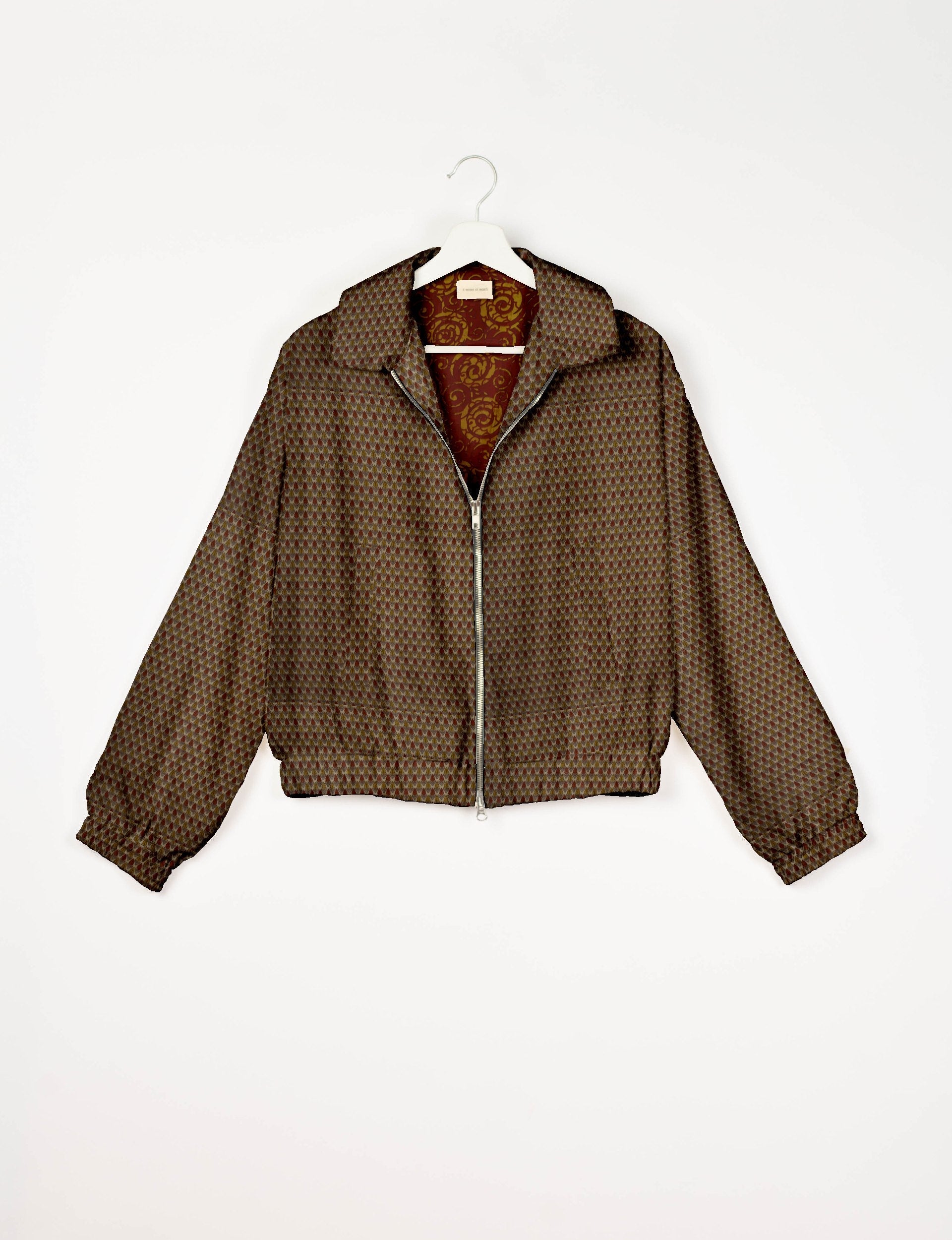 Our Bomber jacket is an iconic wardrobe essential! This military classic features a cropped shape, with elasticated bottom, hem and cuffs. It comes with 2 welt pockets and twin metallic zippers down the front. Also comes with contrast sari print lining and collar flip. Perfect layer for spring days, cool evenings, or air-conditioned workspaces without weighing you down.