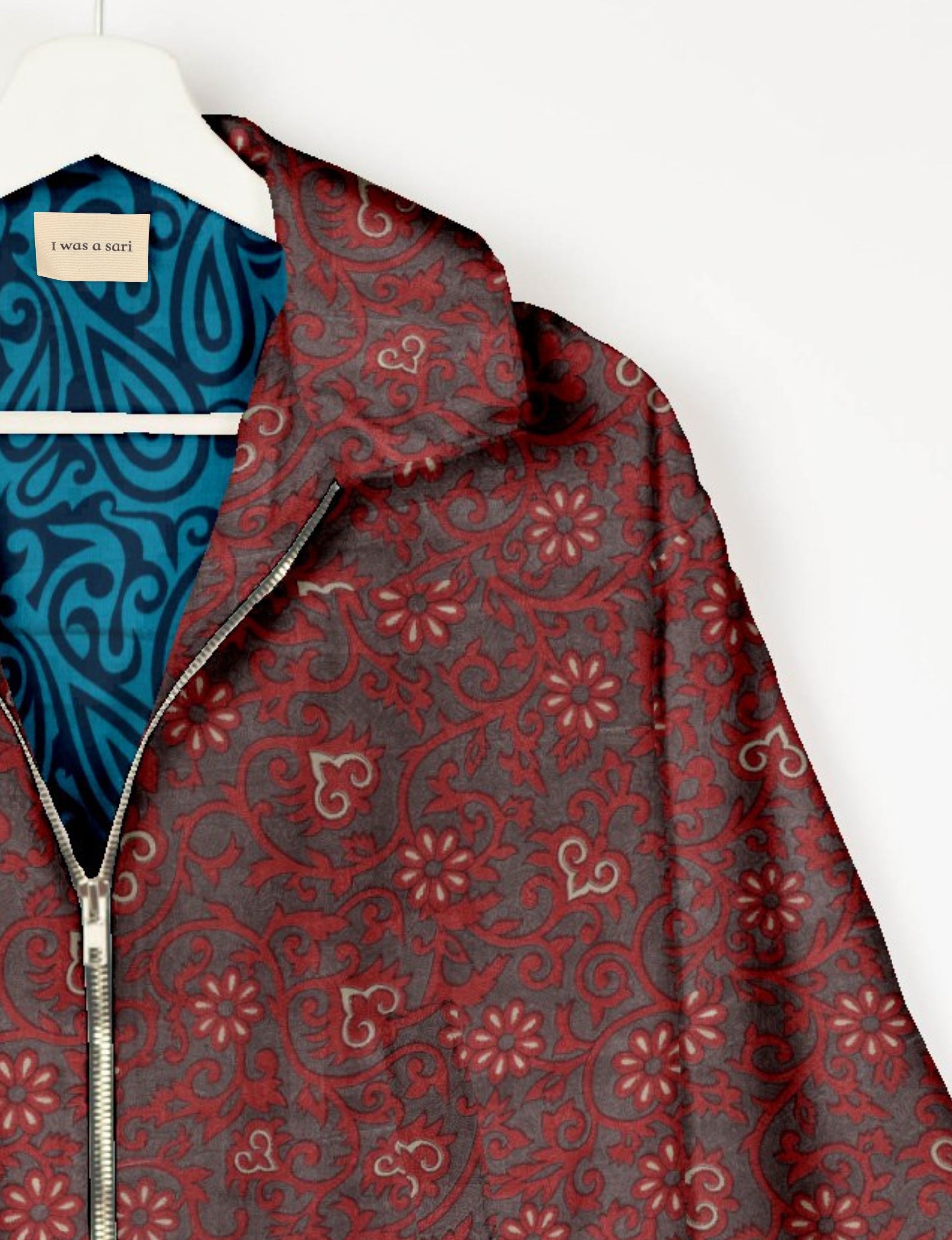 Our Bomber jacket is an iconic wardrobe essential! This military classic features a cropped shape, with elasticated bottom, hem and cuffs. It comes with 2 welt pockets and twin metallic zippers down the front. Also comes with contrast sari print lining and collar flip. Perfect layer for spring days, cool evenings, or air-conditioned workspaces without weighing you down.