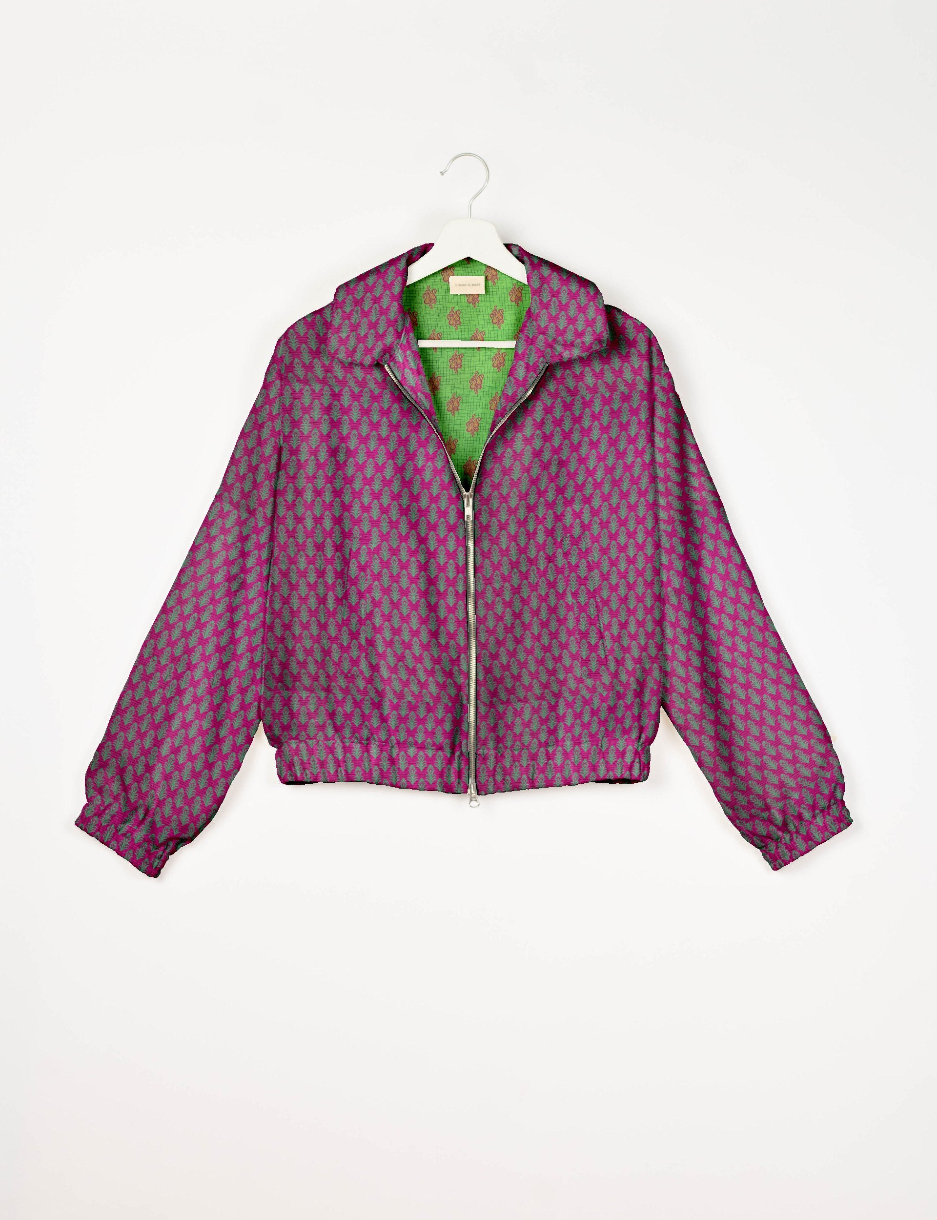 Our Bomber jacket is an iconic wardrobe essential! This military classic features a cropped shape, with elasticated bottom, hem and cuffs. It comes with 2 welt pockets and twin metallic zippers down the front. Also comes with contrast sari print lining and collar flip. Perfect layer for spring days, cool evenings, or air-conditioned workspaces without weighing you down.