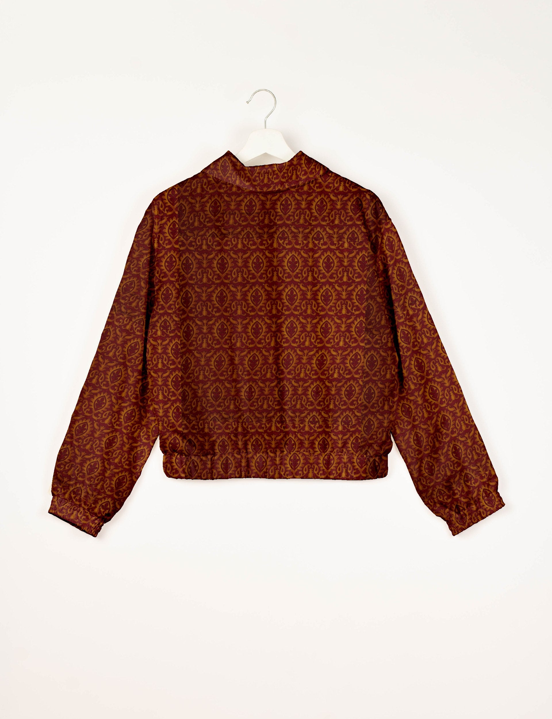 Our Bomber jacket is an iconic wardrobe essential! This military classic features a cropped shape, with elasticated bottom, hem and cuffs. It comes with 2 welt pockets and twin metallic zippers down the front. Also comes with contrast sari print lining and collar flip. Perfect layer for spring days, cool evenings, or air-conditioned workspaces without weighing you down.