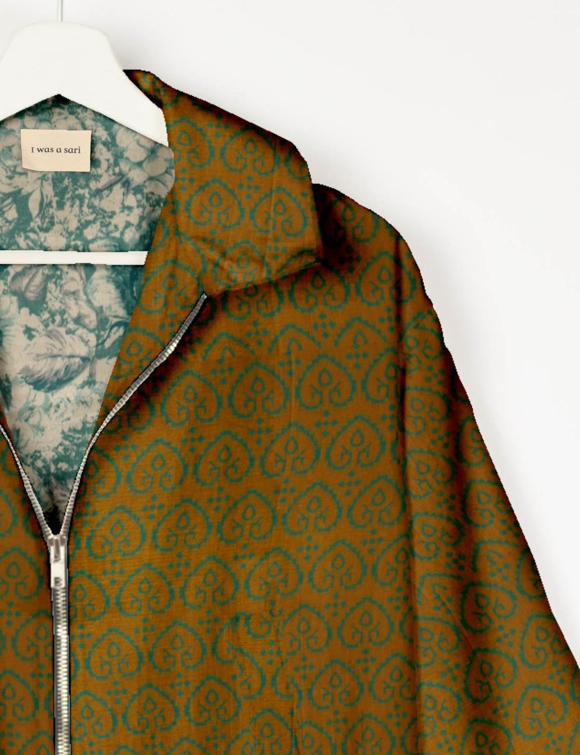 Our Bomber jacket is an iconic wardrobe essential! This military classic features a cropped shape, with elasticated bottom, hem and cuffs. It comes with 2 welt pockets and twin metallic zippers down the front. Also comes with contrast sari print lining and collar flip. Perfect layer for spring days, cool evenings, or air-conditioned workspaces without weighing you down.