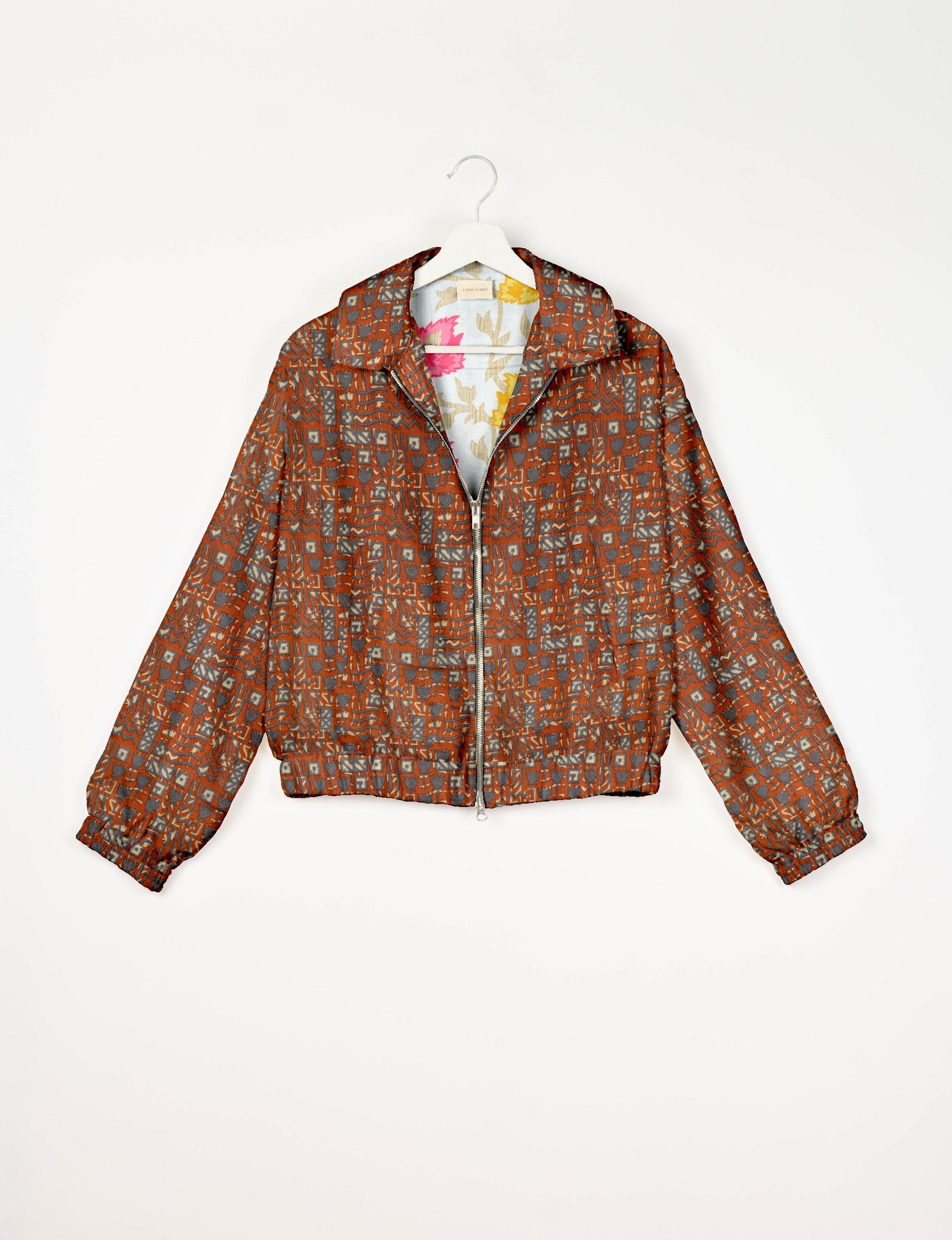 Our Bomber jacket is an iconic wardrobe essential! This military classic features a cropped shape, with elasticated bottom, hem and cuffs. It comes with 2 welt pockets and twin metallic zippers down the front. Also comes with contrast sari print lining and collar flip. Perfect layer for spring days, cool evenings, or air-conditioned workspaces without weighing you down.