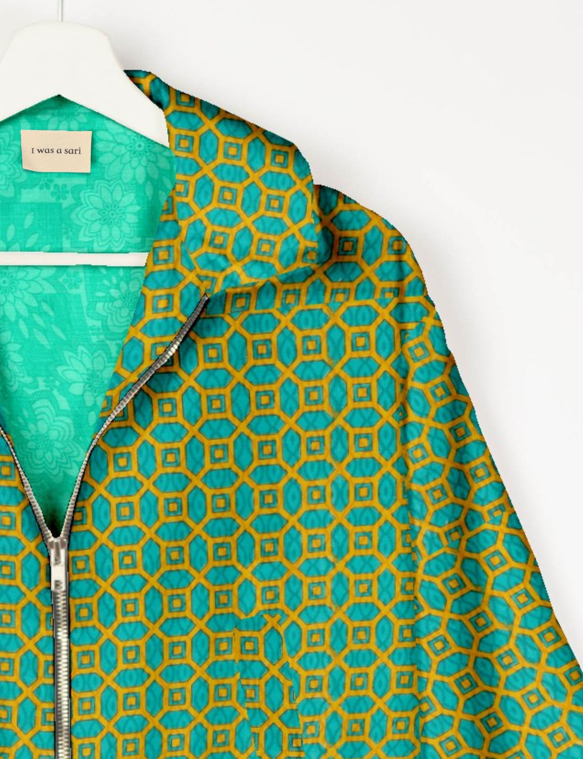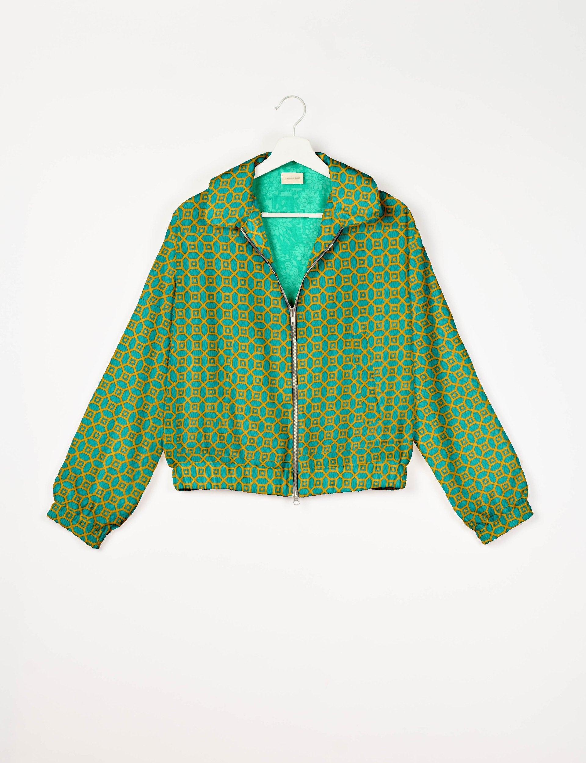 Our Bomber jacket is an iconic wardrobe essential! This military classic features a cropped shape, with elasticated bottom, hem and cuffs. It comes with 2 welt pockets and twin metallic zippers down the front. Also comes with contrast sari print lining and collar flip. Perfect layer for spring days, cool evenings, or air-conditioned workspaces without weighing you down.