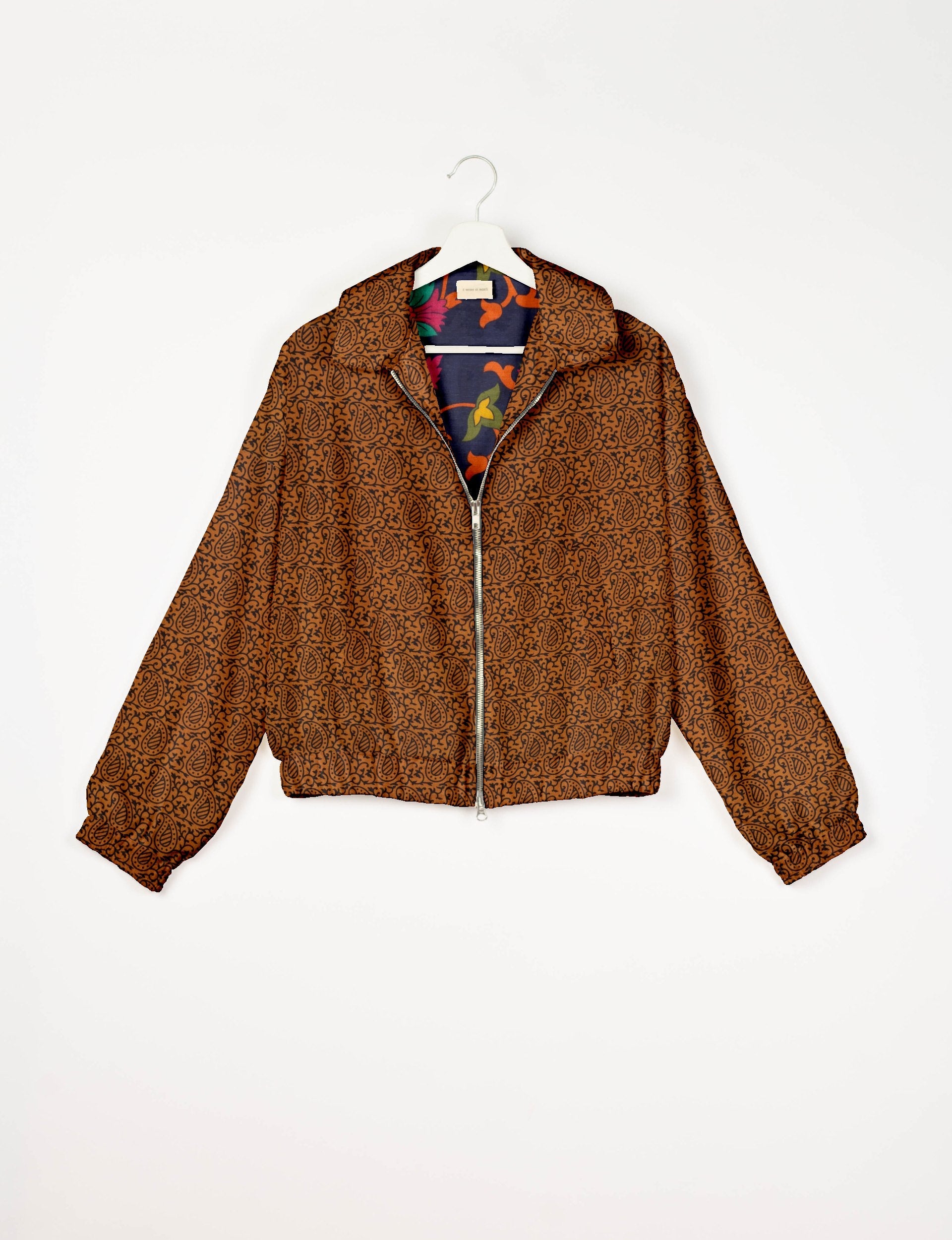Our Bomber jacket is an iconic wardrobe essential! This military classic features a cropped shape, with elasticated bottom, hem and cuffs. It comes with 2 welt pockets and twin metallic zippers down the front. Also comes with contrast sari print lining and collar flip. Perfect layer for spring days, cool evenings, or air-conditioned workspaces without weighing you down.