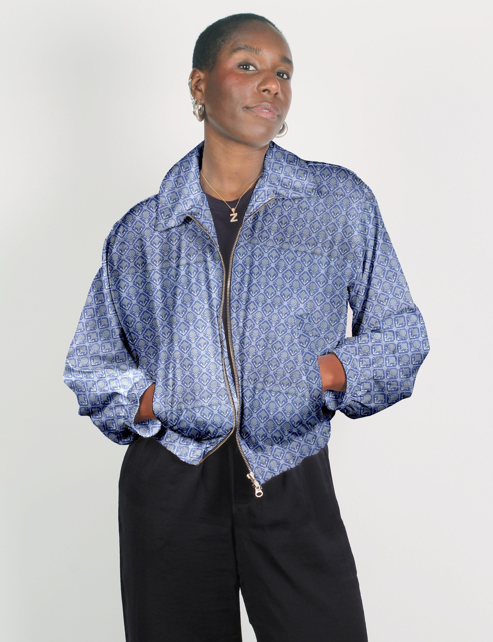 Our Bomber jacket is an iconic wardrobe essential! This military classic features a cropped shape, with elasticated bottom, hem and cuffs. It comes with 2 welt pockets and twin metallic zippers down the front. Also comes with contrast sari print lining and collar flip. Perfect layer for spring days, cool evenings, or air-conditioned workspaces without weighing you down.