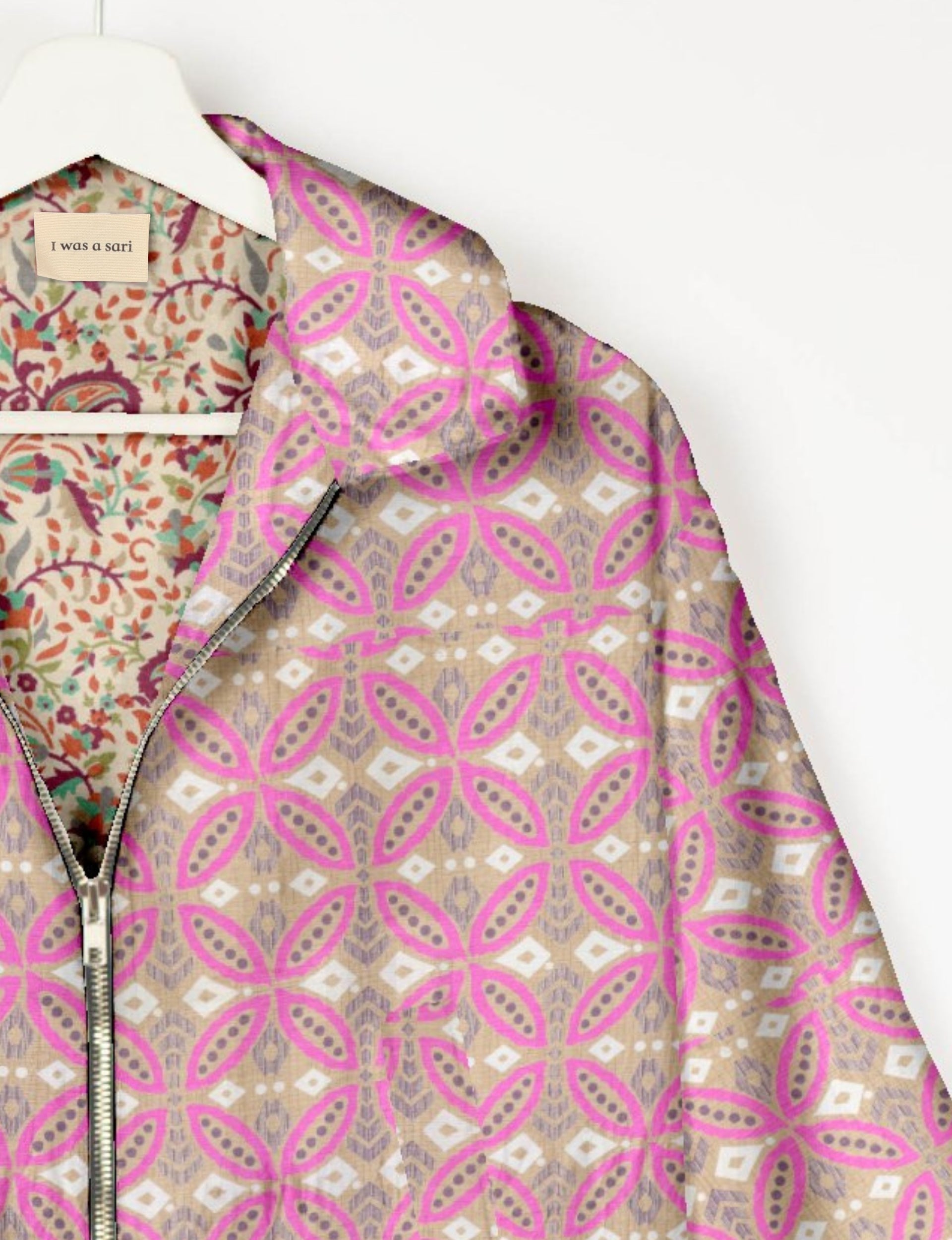 Our Bomber jacket is an iconic wardrobe essential! This military classic features a cropped shape, with elasticated bottom, hem and cuffs. It comes with 2 welt pockets and twin metallic zippers down the front. Also comes with contrast sari print lining and collar flip. Perfect layer for spring days, cool evenings, or air-conditioned workspaces without weighing you down.