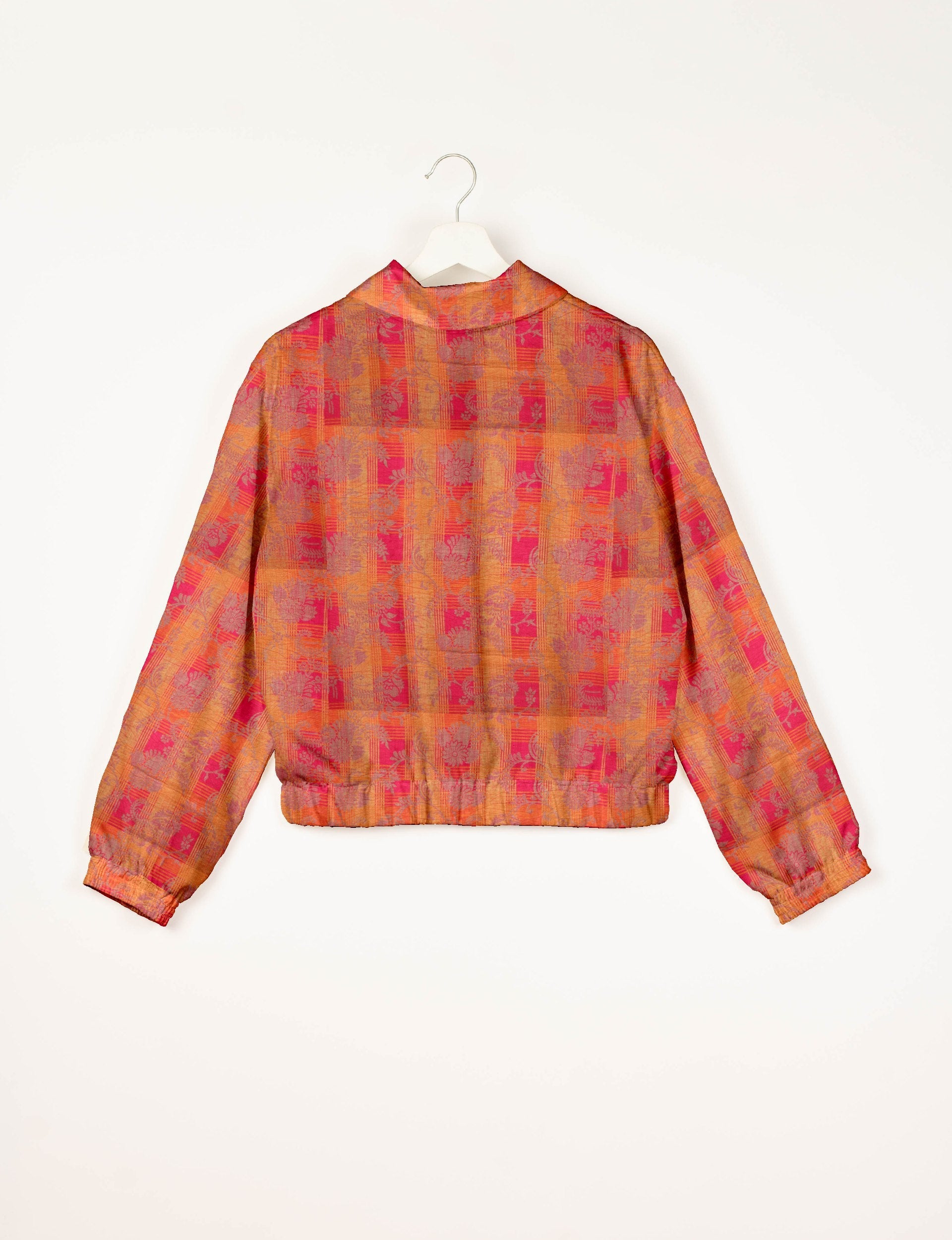 Our Bomber jacket is an iconic wardrobe essential! This military classic features a cropped shape, with elasticated bottom, hem and cuffs. It comes with 2 welt pockets and twin metallic zippers down the front. Also comes with contrast sari print lining and collar flip. Perfect layer for spring days, cool evenings, or air-conditioned workspaces without weighing you down.