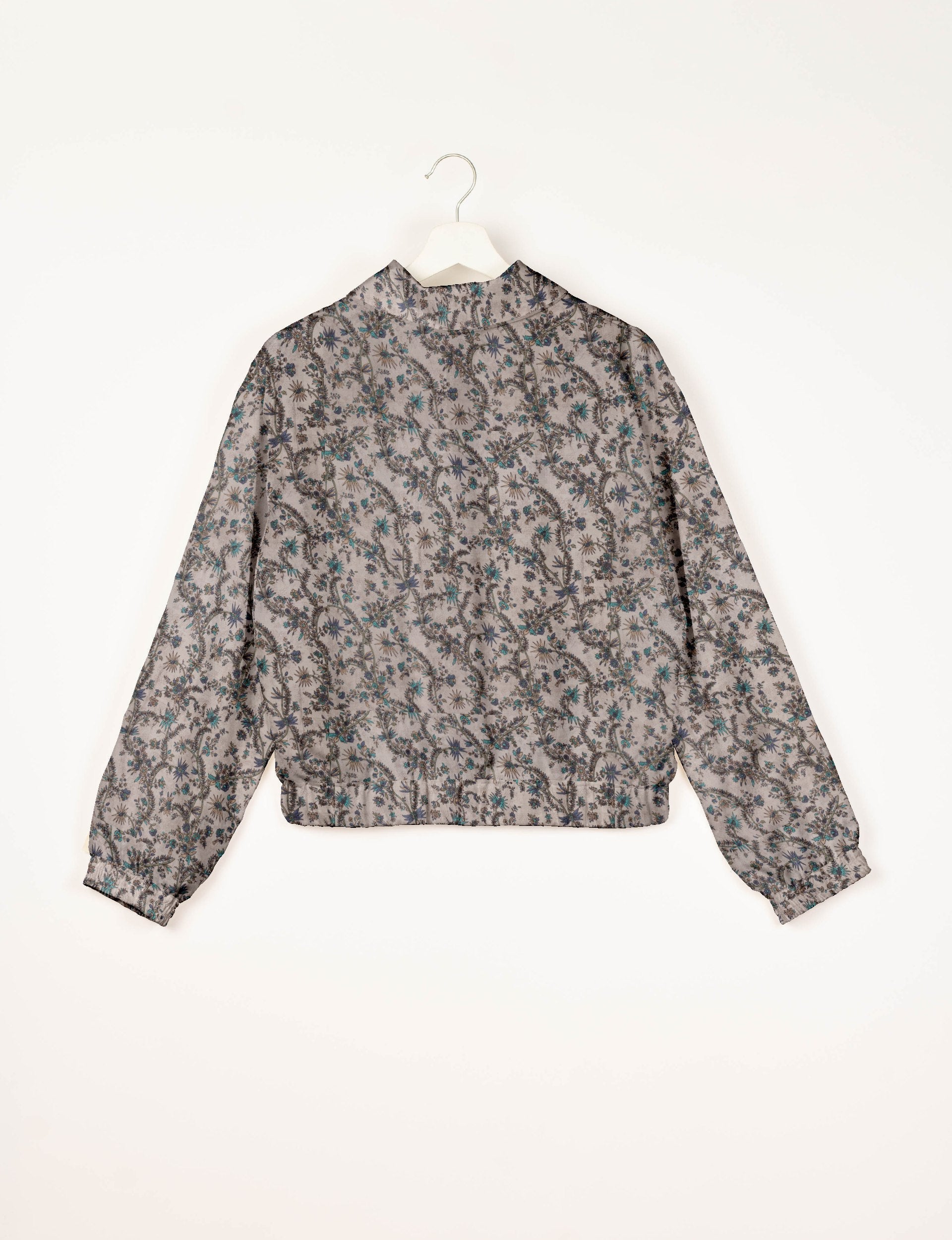Our Bomber jacket is an iconic wardrobe essential! This military classic features a cropped shape, with elasticated bottom, hem and cuffs. It comes with 2 welt pockets and twin metallic zippers down the front. Also comes with contrast sari print lining and collar flip. Perfect layer for spring days, cool evenings, or air-conditioned workspaces without weighing you down.
