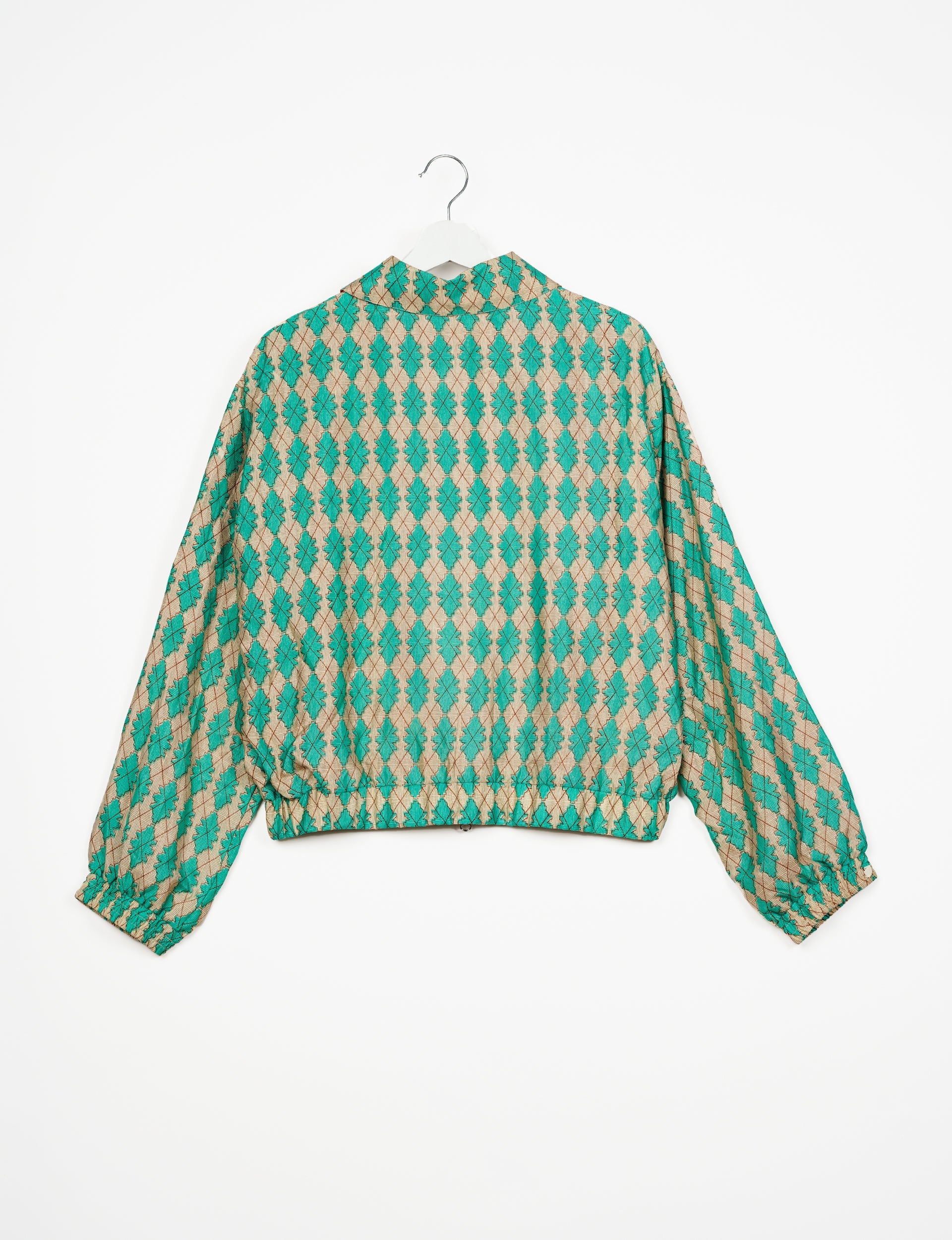 Our Bomber jacket is an iconic wardrobe essential! This military classic features a cropped shape, with elasticated bottom, hem and cuffs. It comes with 2 welt pockets and twin metallic zippers down the front. Also comes with contrast sari print lining and collar flip. Perfect layer for spring days, cool evenings, or air-conditioned workspaces without weighing you down.