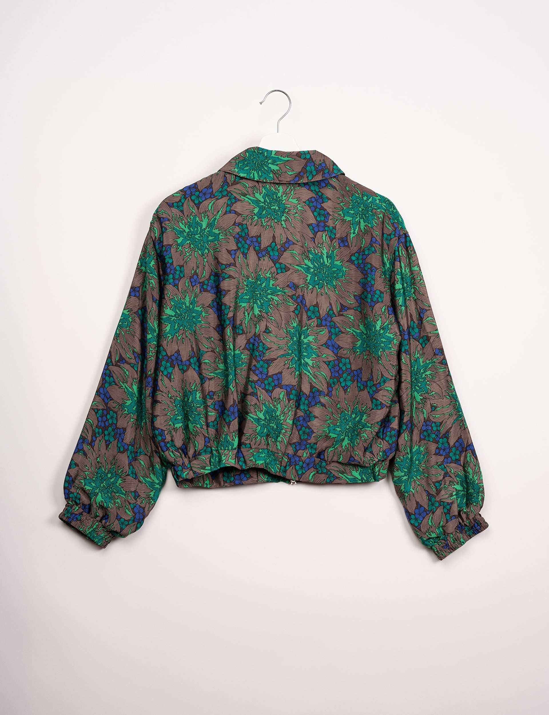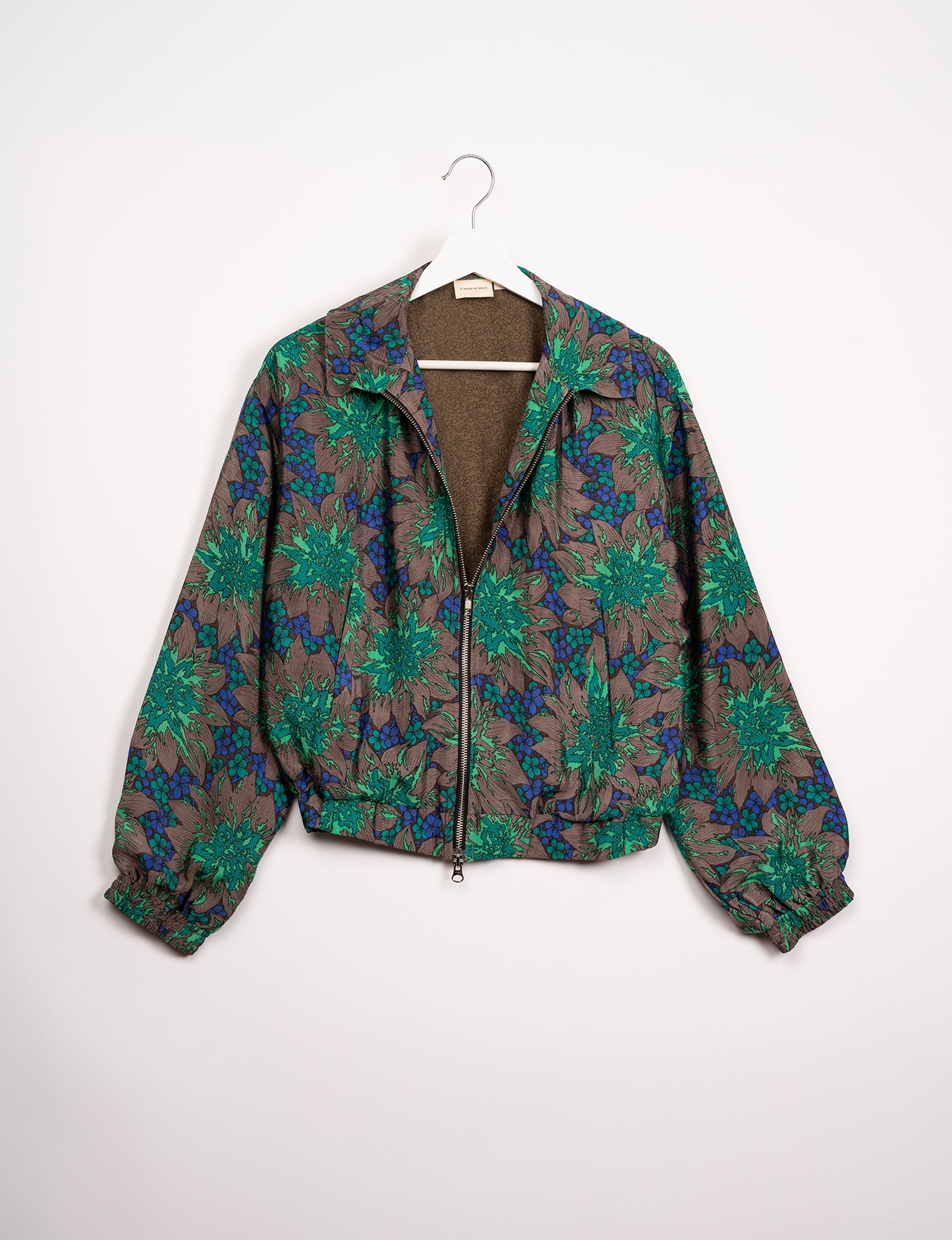 Our Bomber jacket is an iconic wardrobe essential! This military classic features a cropped shape, with elasticated bottom, hem and cuffs. It comes with 2 welt pockets and twin metallic zippers down the front. Also comes with contrast sari print lining and collar flip. Perfect layer for spring days, cool evenings, or air-conditioned workspaces without weighing you down.