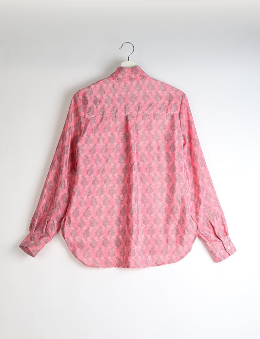 A long-sleeve button down shirt with a relaxed fit and a front placket finished with a self-fabric neck tie. The hemline is curved, and the sleeves are full-length with buttoned cuffs for a structured finish.
