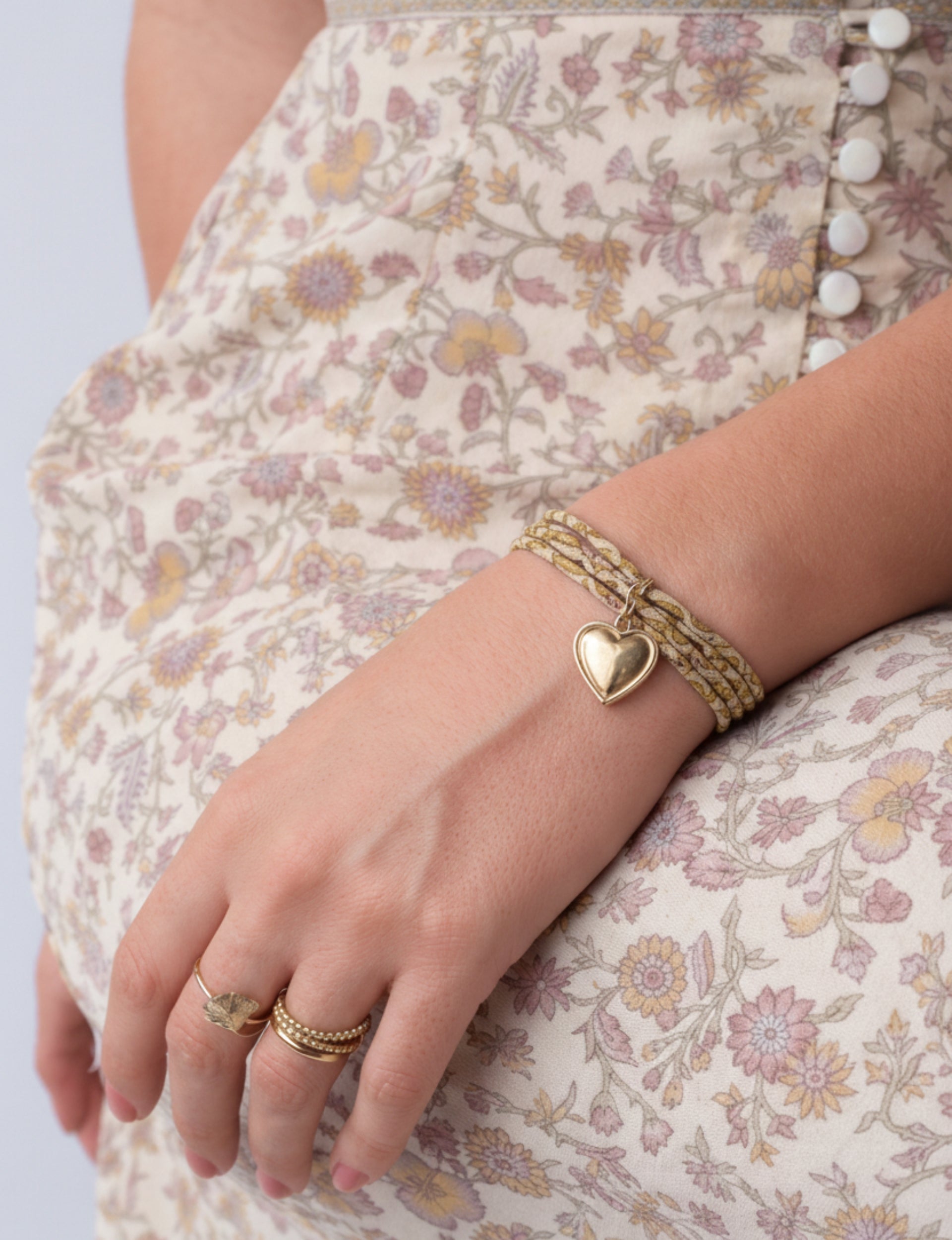 Slim cord bracelet designed to wrap around the wrist and tie for an adjustable fit. Features a single heart charm suspended at the centre.