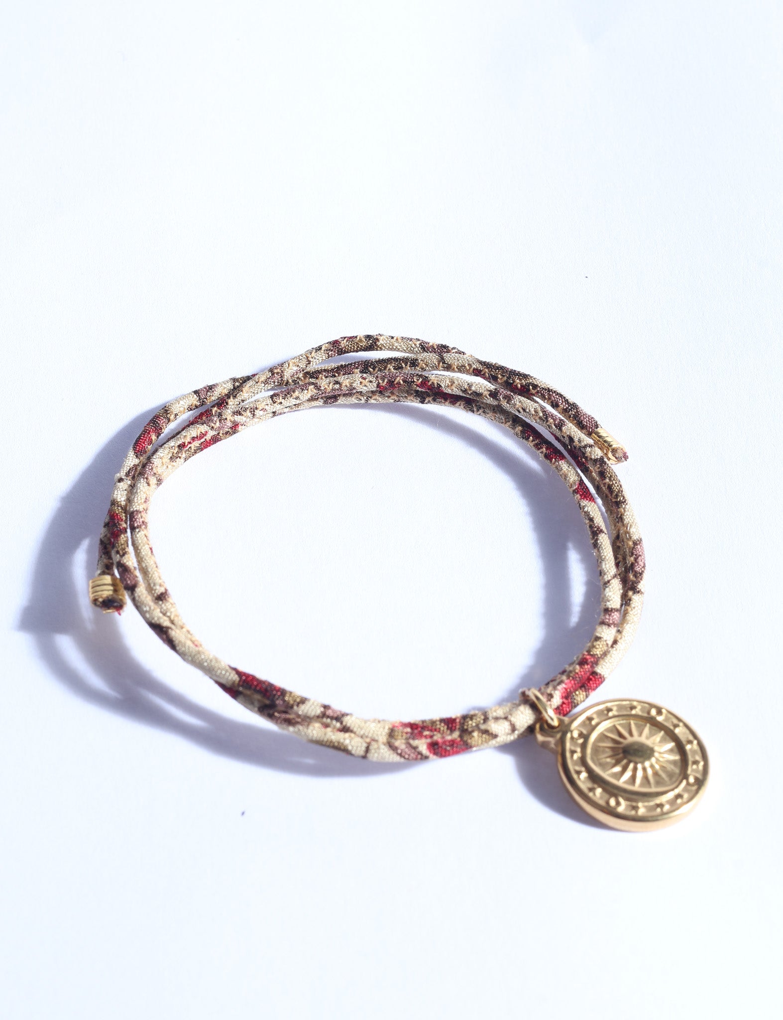 Slim cord bracelet designed to wrap around the wrist and tie for an adjustable fit. Features a single sun medallion charm suspended at the centre. Charm is stainless steel with 18K gold plating. Metal components are lead free and nickel safe. Size : L 7 cm, Charm 1.5 cm
