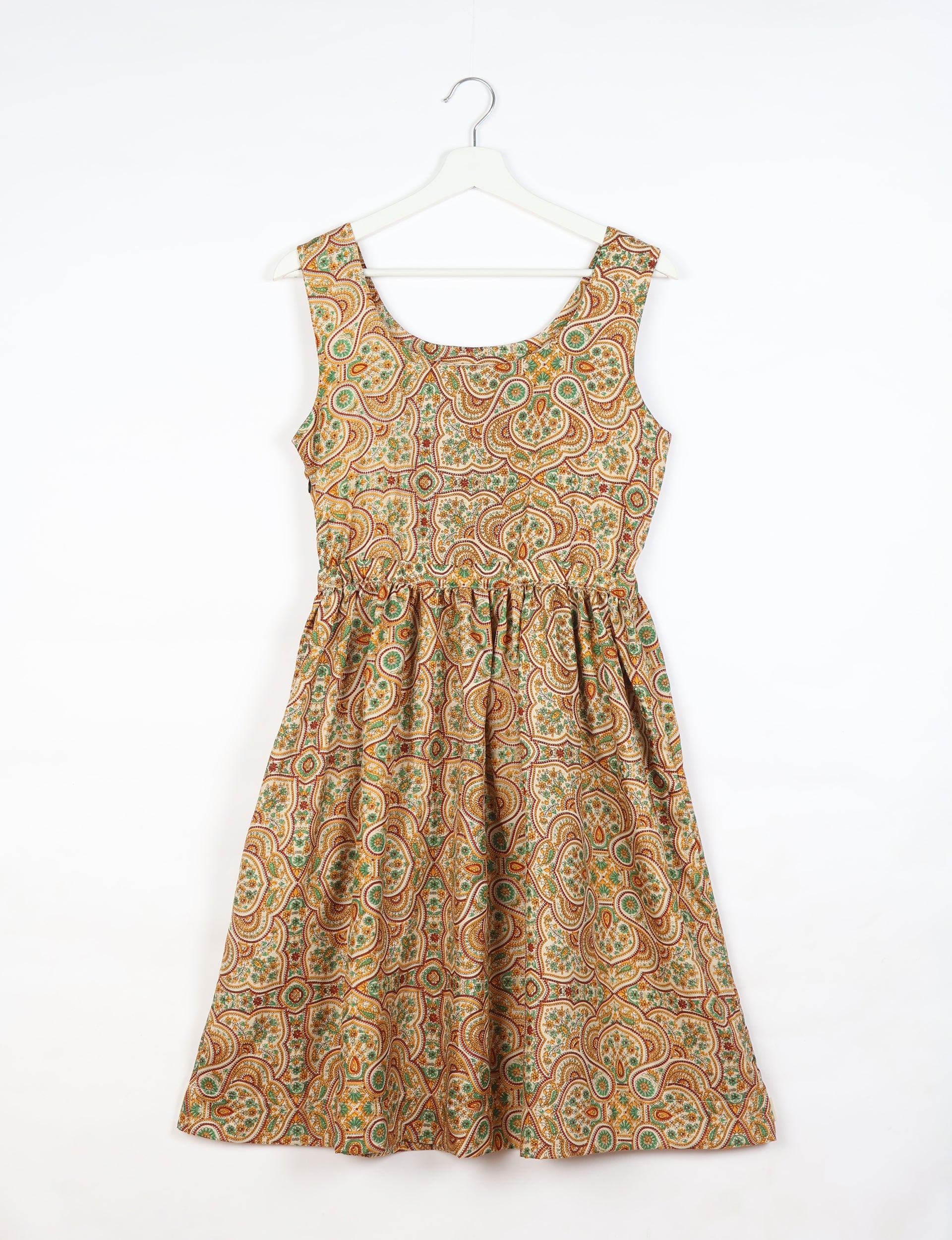This is a sleeveless fit-and-flare dress featuring a scooped neckline and a defined waist seam. The waistline is cinched with elastic for comfort and flexibility, leading into a gathered flared skirt that finishes at knee length. Lighting and screens may cause slight variations in color appearance.