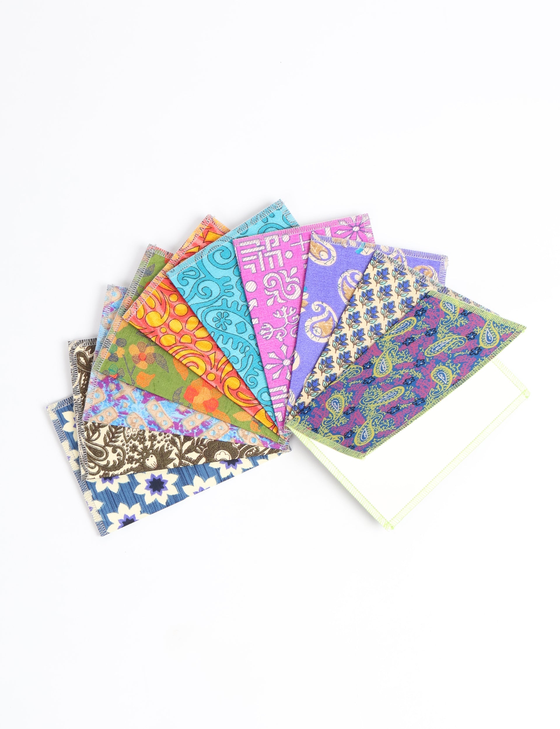 Made with 100% recycled paper, this set of assorted folded postcards are made with printed sari fabric and features contrast overlock edging. Come with envelopes.