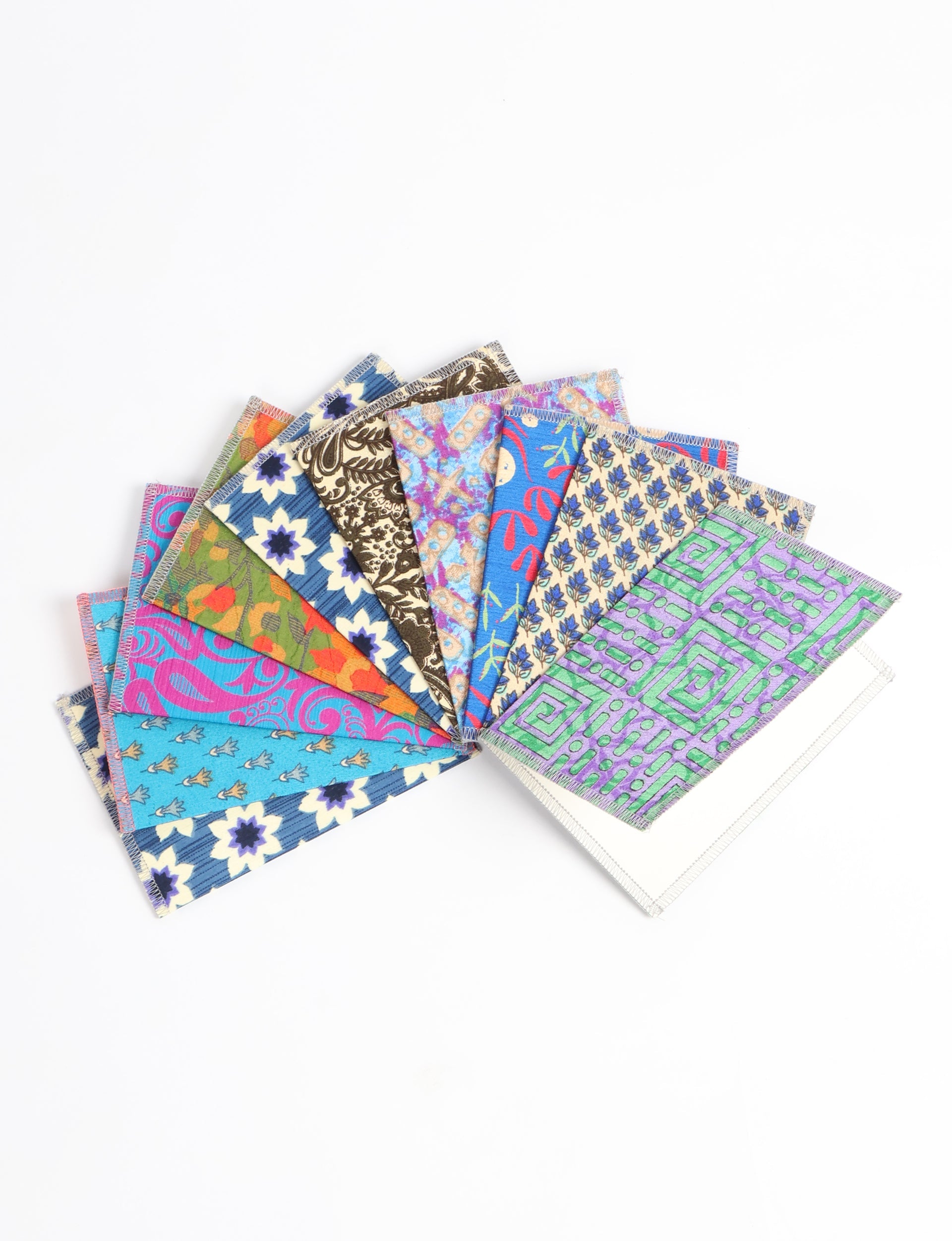 Made with 100% recycled paper, this set of assorted folded postcards are made with printed sari fabric and features contrast overlock edging. Come with envelopes.