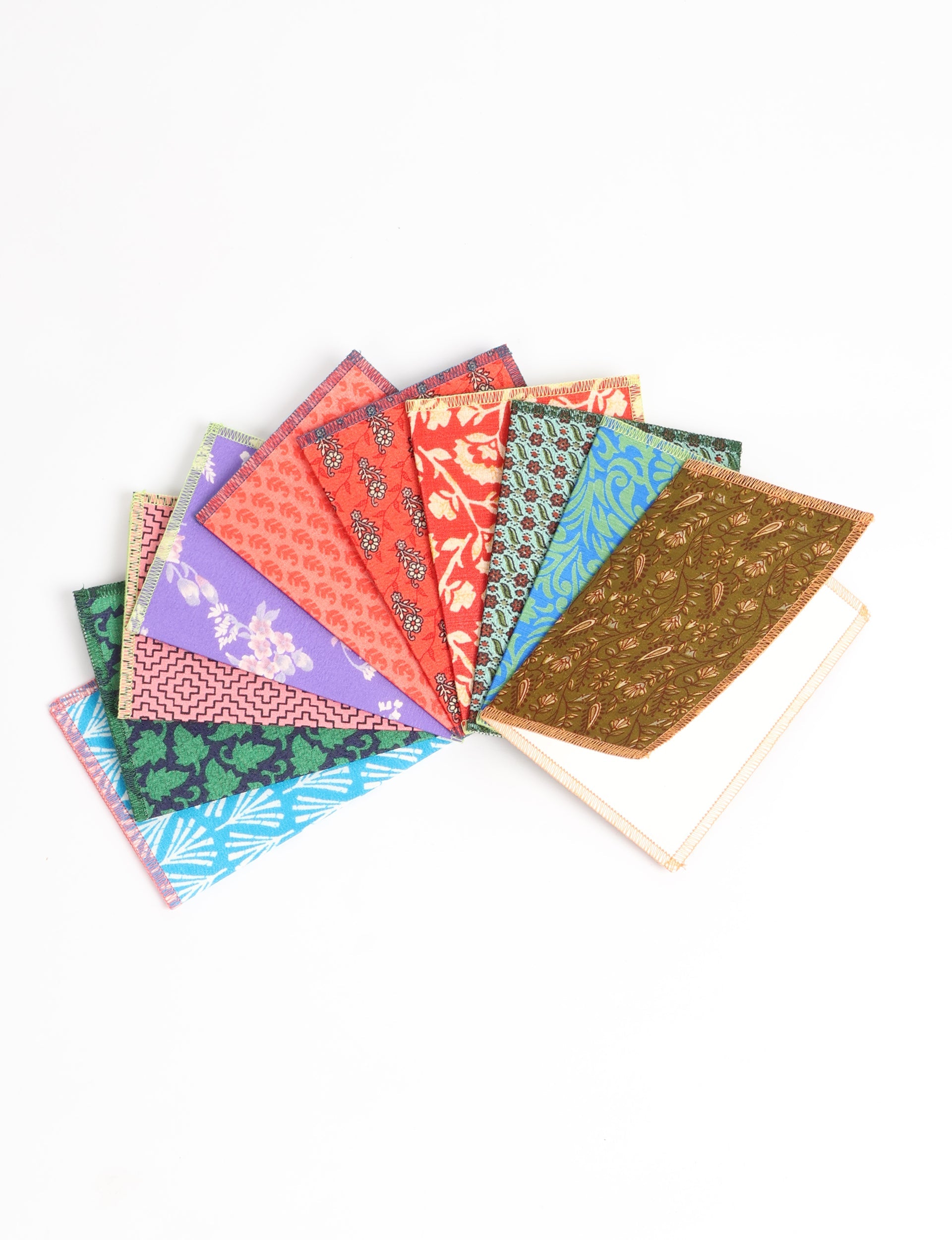 Made with 100% recycled paper, this set of assorted folded postcards are made with printed sari fabric and features contrast overlock edging. Come with envelopes.