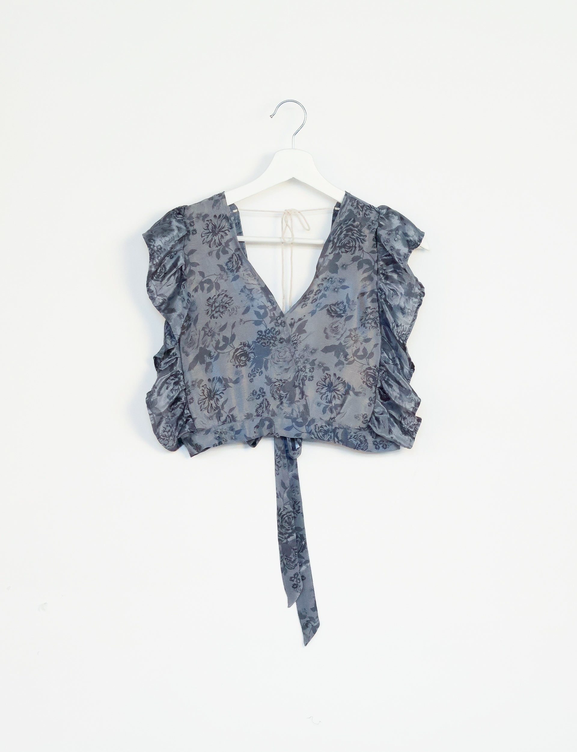 Two-piece co-ord set comprising a crop top and a frill-detail wrap skirt. The top features a V-neckline, back tie closure with a long drawstring, and short ruffled sleeves. The wrap skirt is designed with an asymmetrical front panel, secured with a side tie, and finished with a cascading frill along the hemline.
