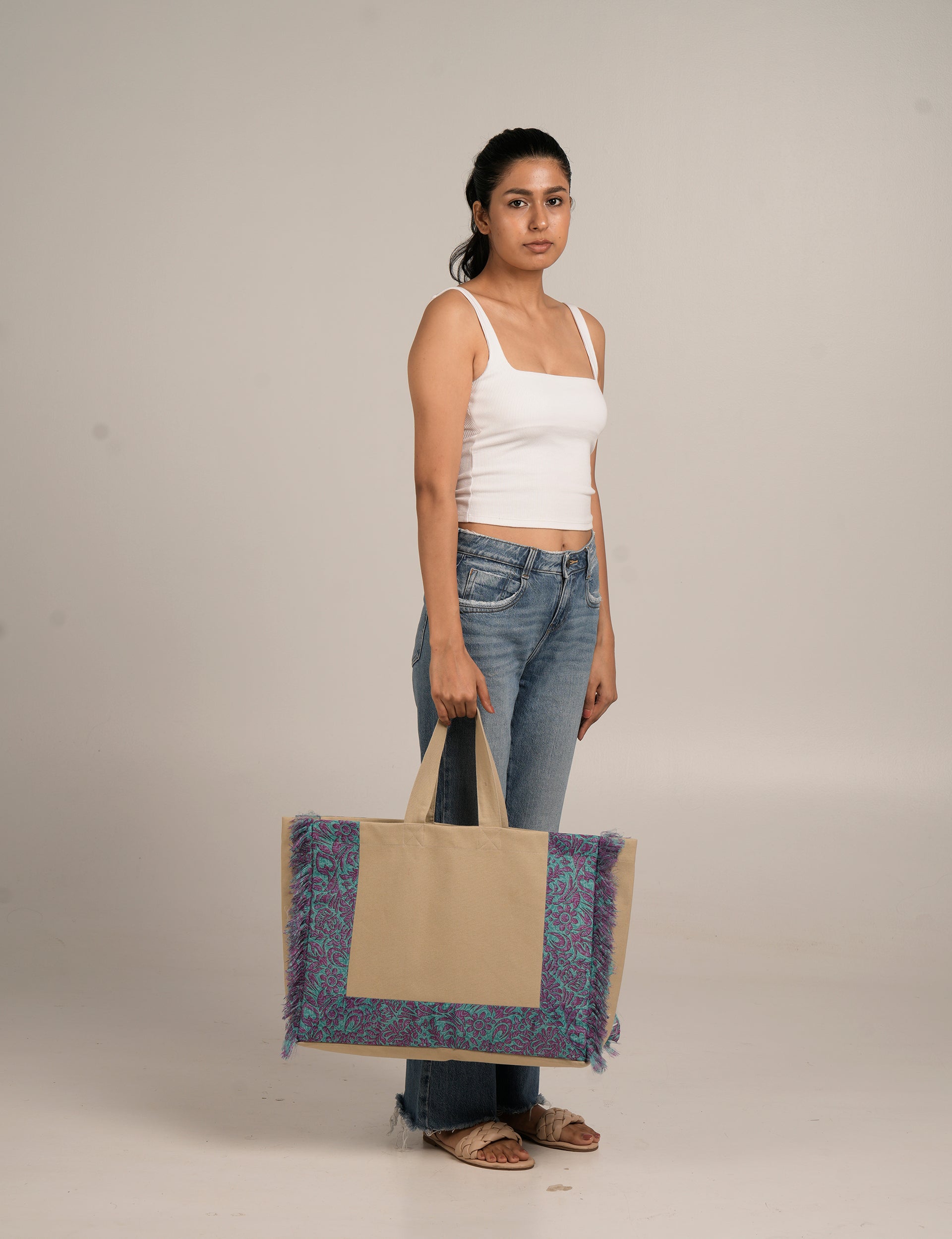 Structured carry-all bag made with a 100% beige cotton canvas base and panels of contrast sari fabric. Features a rectangular silhouette with soft sari-fringed edging on both sides and full sari-fabric lining inside. Also features a wide gusseted base. Lighting and screens may cause slight variations in color appearance.