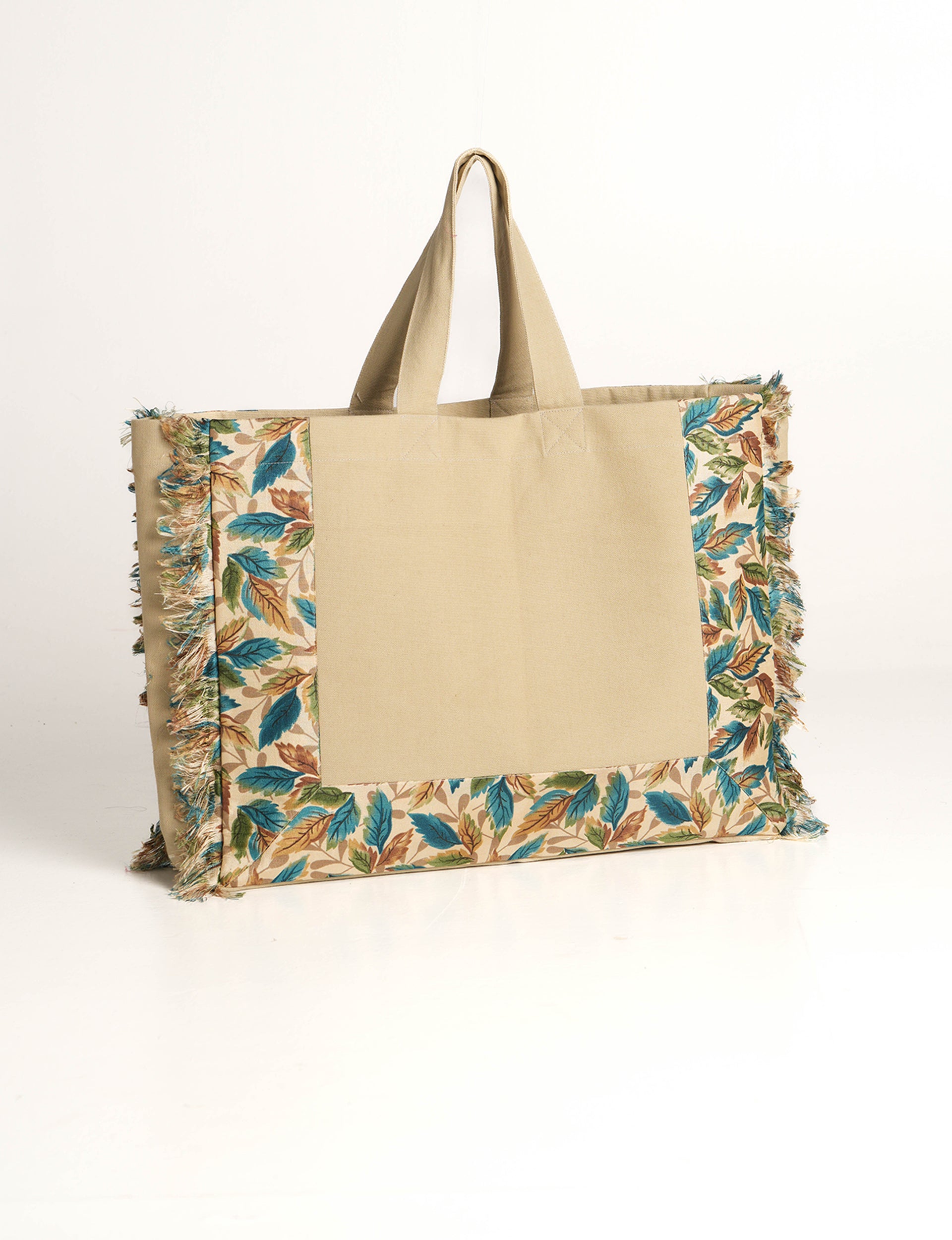 Structured carry-all bag made with a 100% beige cotton canvas base and panels of contrast sari fabric. Features a rectangular silhouette with soft sari-fringed edging on both sides and full sari-fabric lining inside. Also features a wide gusseted base. Lighting and screens may cause slight variations in color appearance.