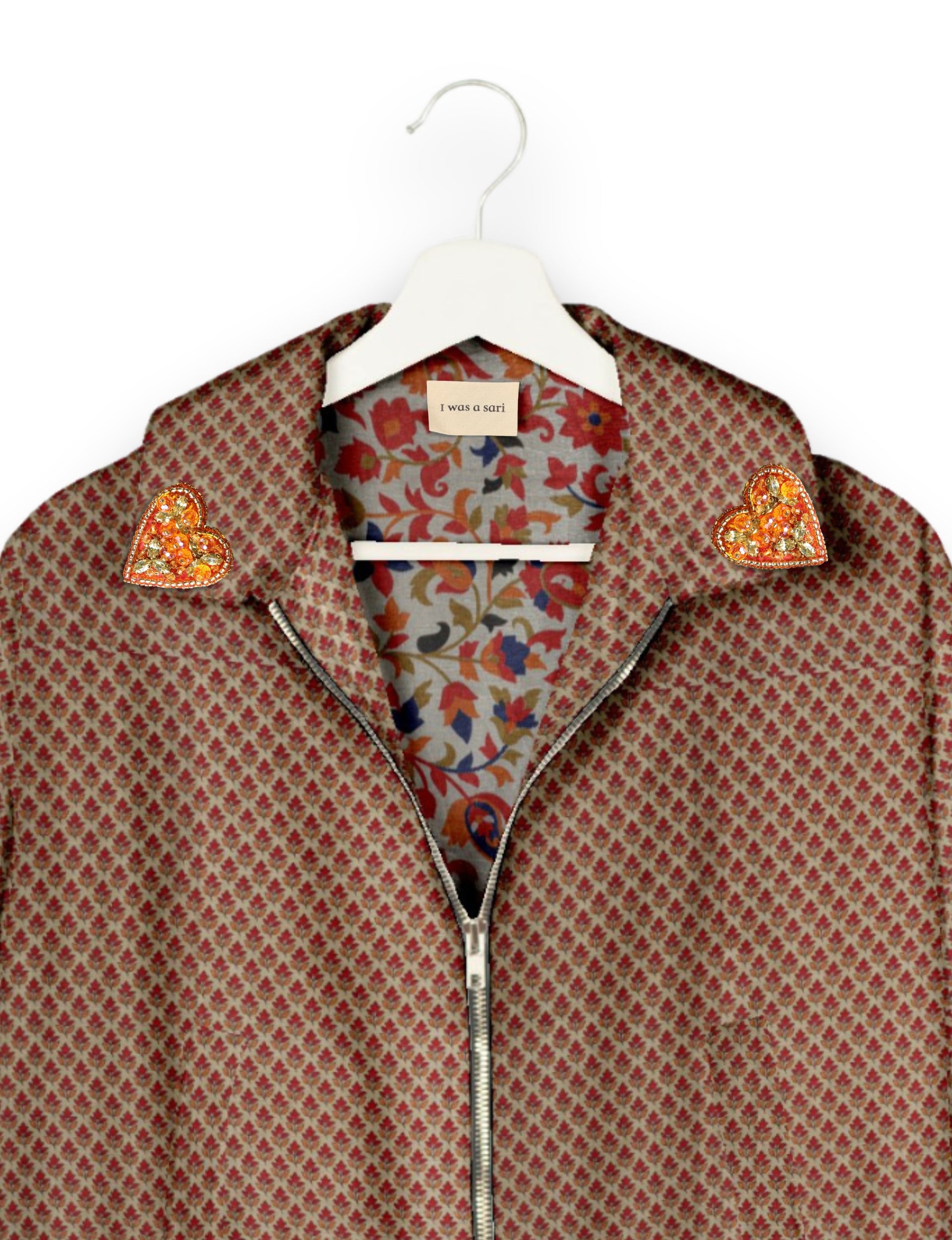 Introducing the Heart Bomber, a limited-edition sustainable fashion statement crafted from upcycled saris. Featuring intricate Aari embroidery hand-stitched by skilled female artisans, this zero waste clothing piece embodies ethical fashion and slow fashion values. Make a conscious choice with this fair trade fashion essential—eco-friendly, repurposed, and made from recycled materials. Elevate your wardrobe with carbon-neutral fashion that tells a story of artistry and sustainability. Lighting and screens may cause slight variations in color appearance.