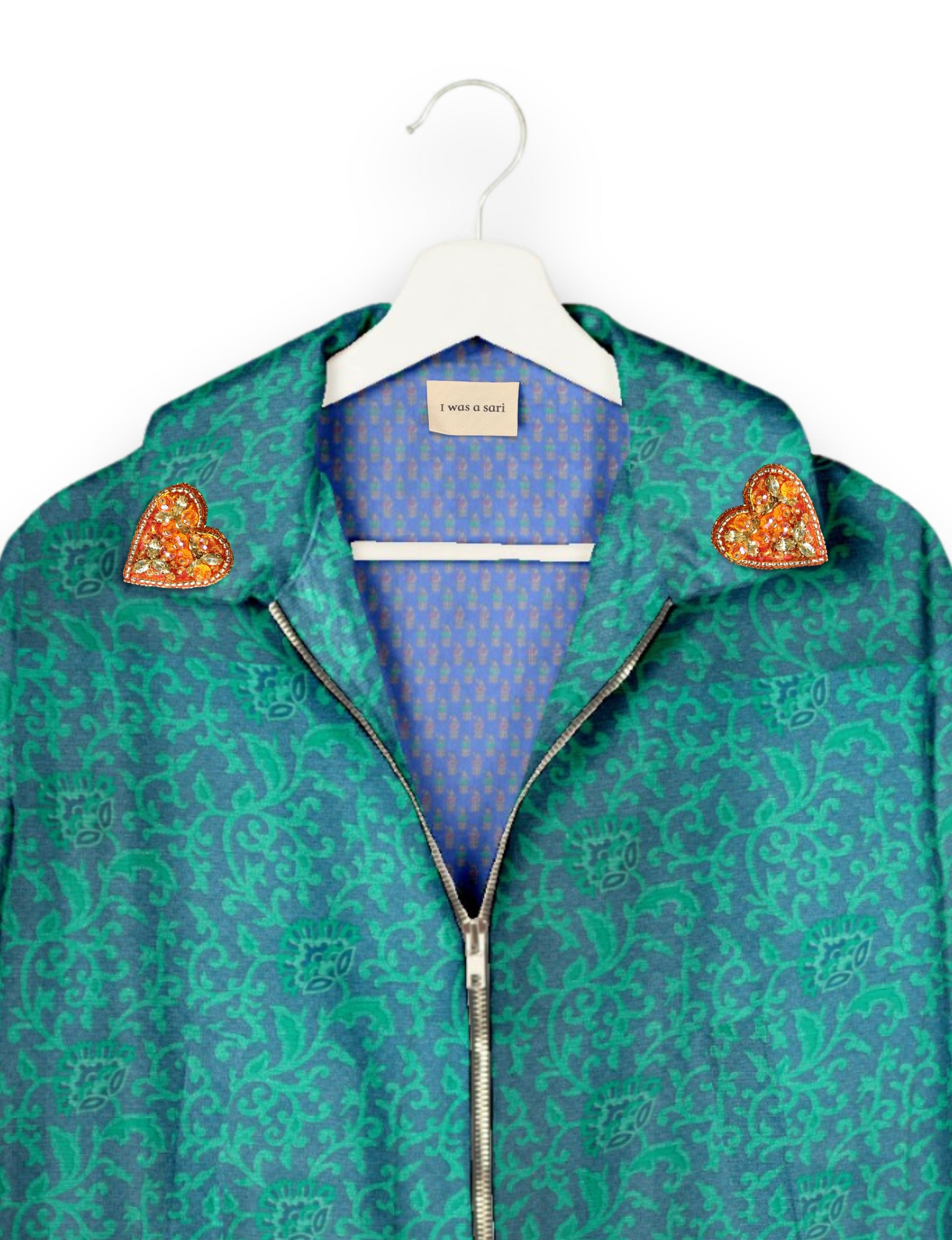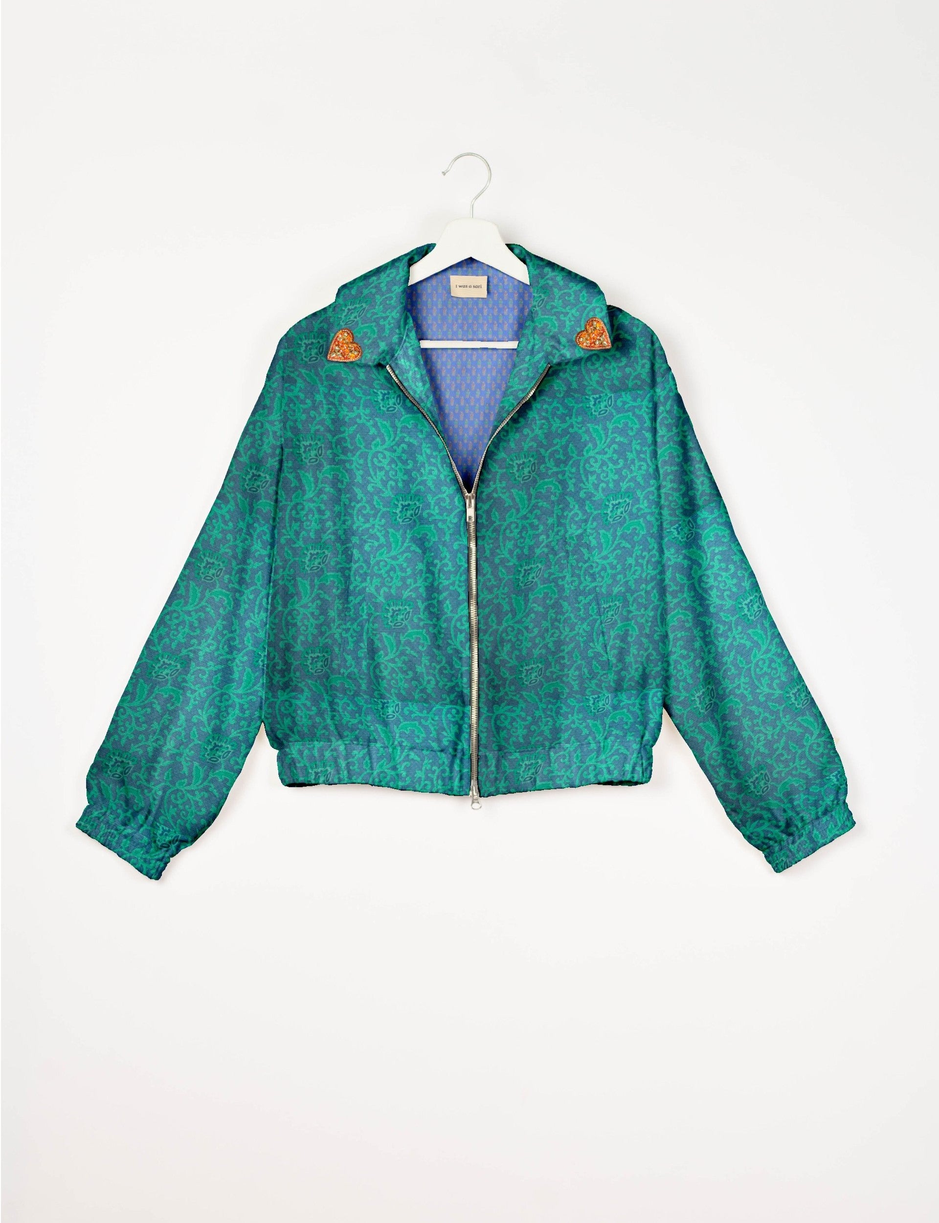Introducing the Heart Bomber, a limited-edition sustainable fashion statement crafted from upcycled saris. Featuring intricate Aari embroidery hand-stitched by skilled female artisans, this zero waste clothing piece embodies ethical fashion and slow fashion values. Make a conscious choice with this fair trade fashion essential—eco-friendly, repurposed, and made from recycled materials. Elevate your wardrobe with carbon-neutral fashion that tells a story of artistry and sustainability. Lighting and screens may cause slight variations in color appearance.