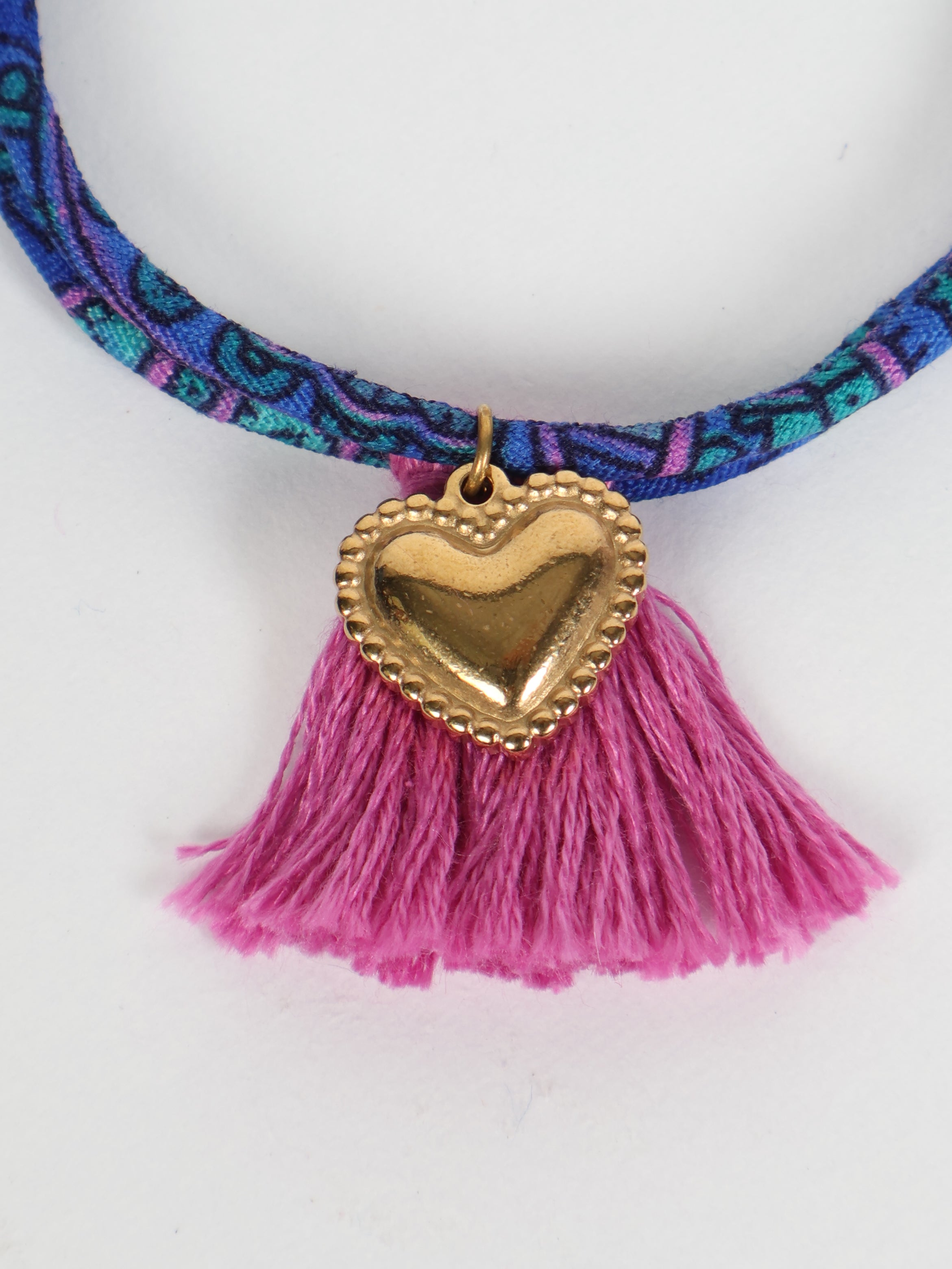 Double-wrap rope bracelet with metallic end caps, finished with tassels and a central gold-tone heart charm. Adjustable wrap style for flexible sizing. Lighting and screens may cause slight variations in color appearance.
