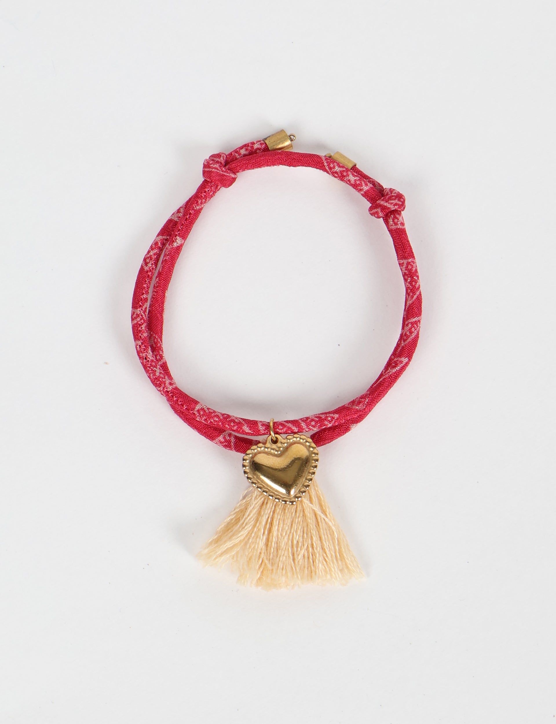 Double-wrap rope bracelet with metallic end caps, finished with tassels and a central gold-tone heart charm. Adjustable wrap style for flexible sizing. Lighting and screens may cause slight variations in color appearance.
