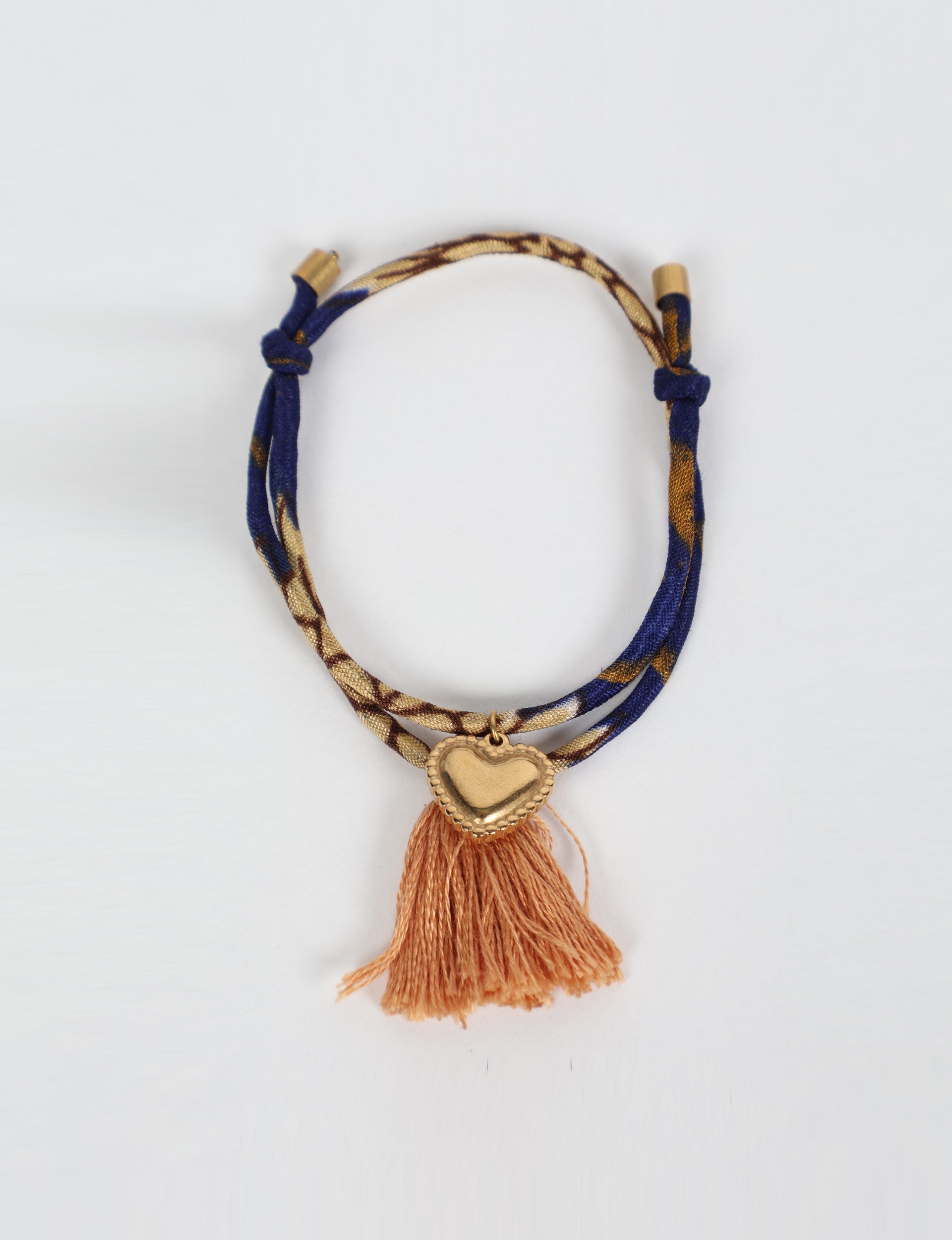 Double-wrap rope bracelet with metallic end caps, finished with tassels and a central gold-tone heart charm. Adjustable wrap style for flexible sizing. Lighting and screens may cause slight variations in color appearance.