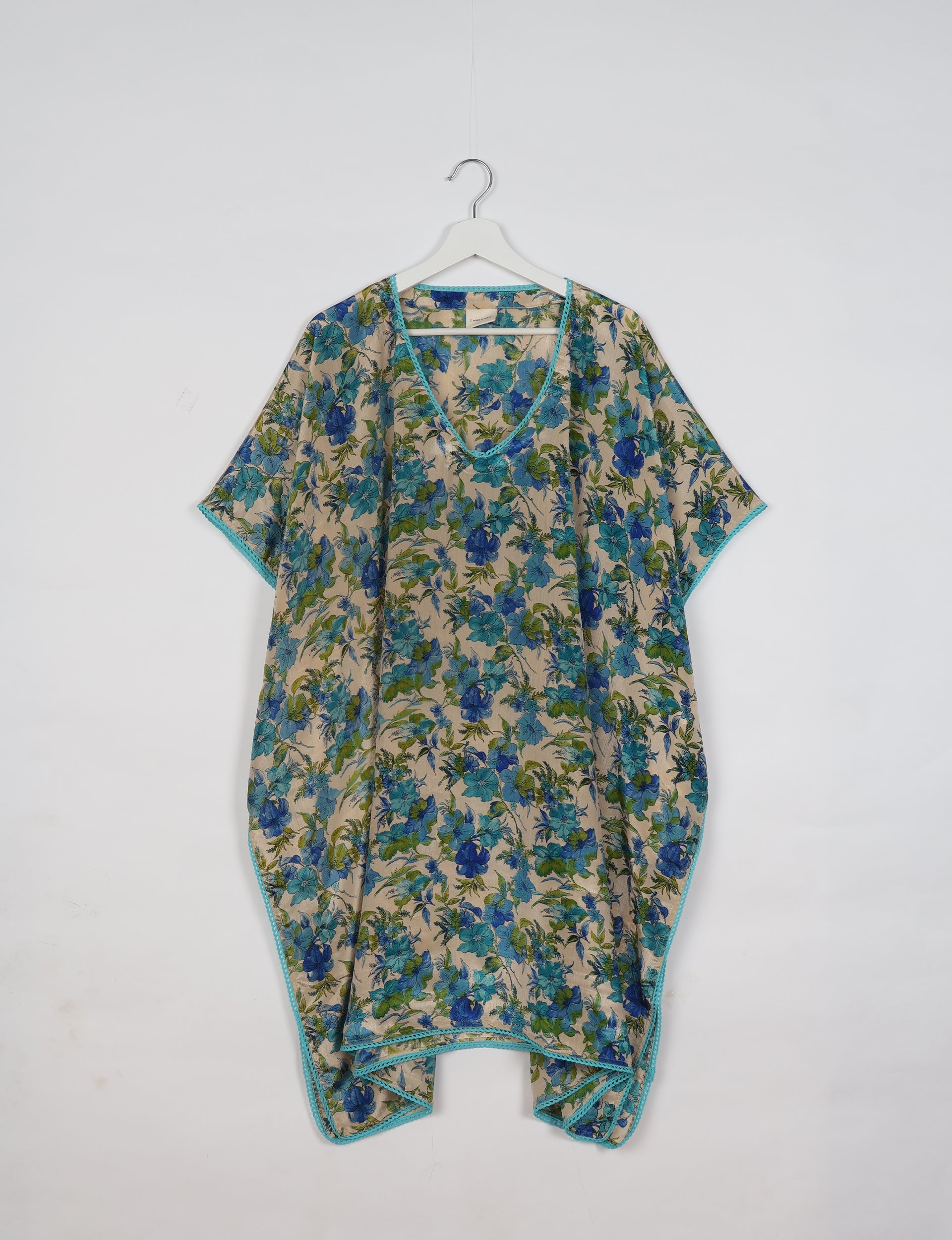 Relaxed-fit kaftan with a V neckline, extended sleeves, and contrasting lace trimmings over the neckline, sides and hemline. Designed in a free-flowing silhouette for ease of movement and comfort.
