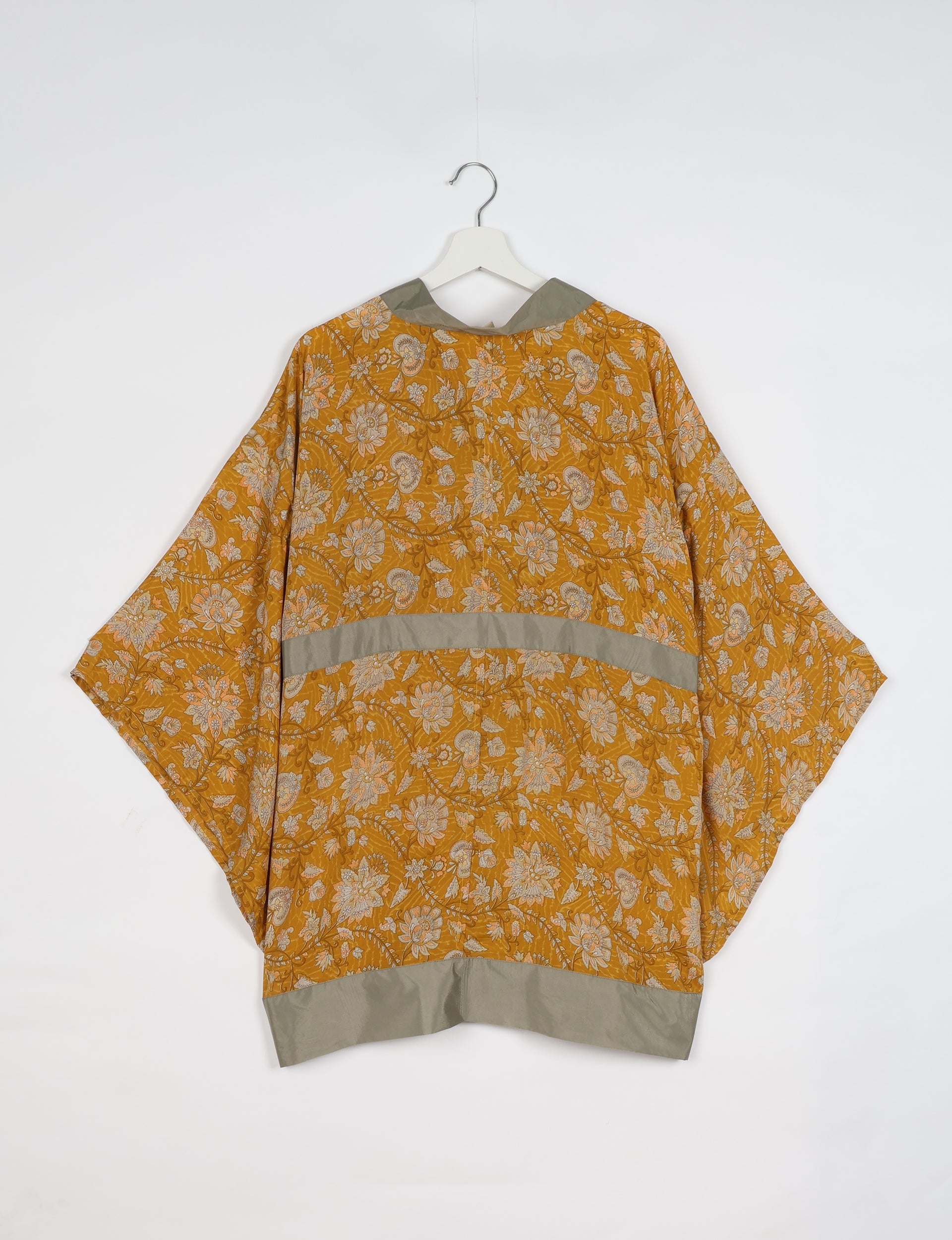 Kimono-style layer with wide sleeves and an open front. Features contrast borders along the edges and comes with a matching fabric belt for optional closure. Designed as a relaxed, one-size-fits-most silhouette.