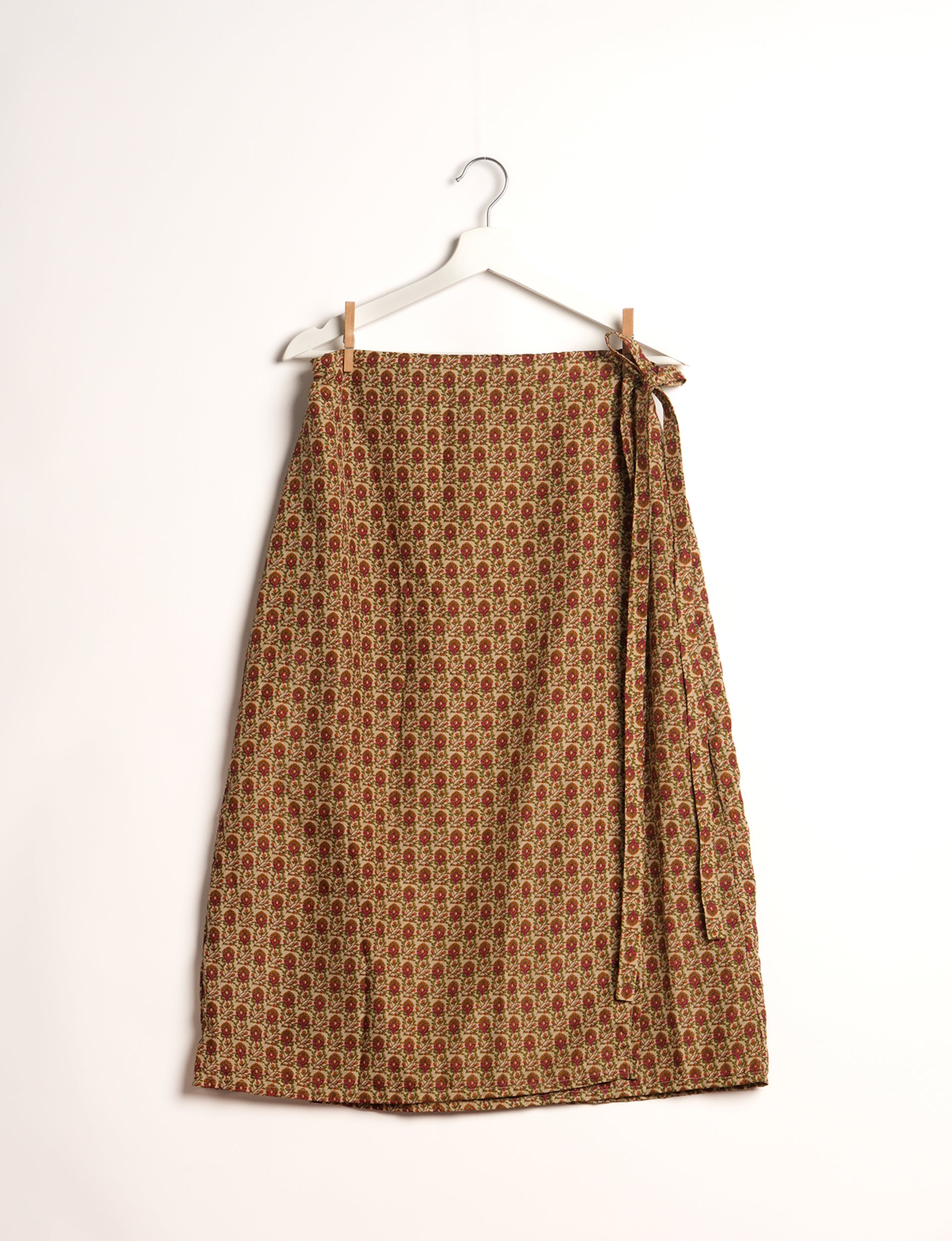 This is a midi length wrap skirt with an adjustable tie closure at the waist. The waistband is partially elasticated at the back for flexible sizing and added comfort. The wrap panel overlaps at the front and secures with a fabric tie at the side. The silhouette is straight with a gentle flare towards the hem.