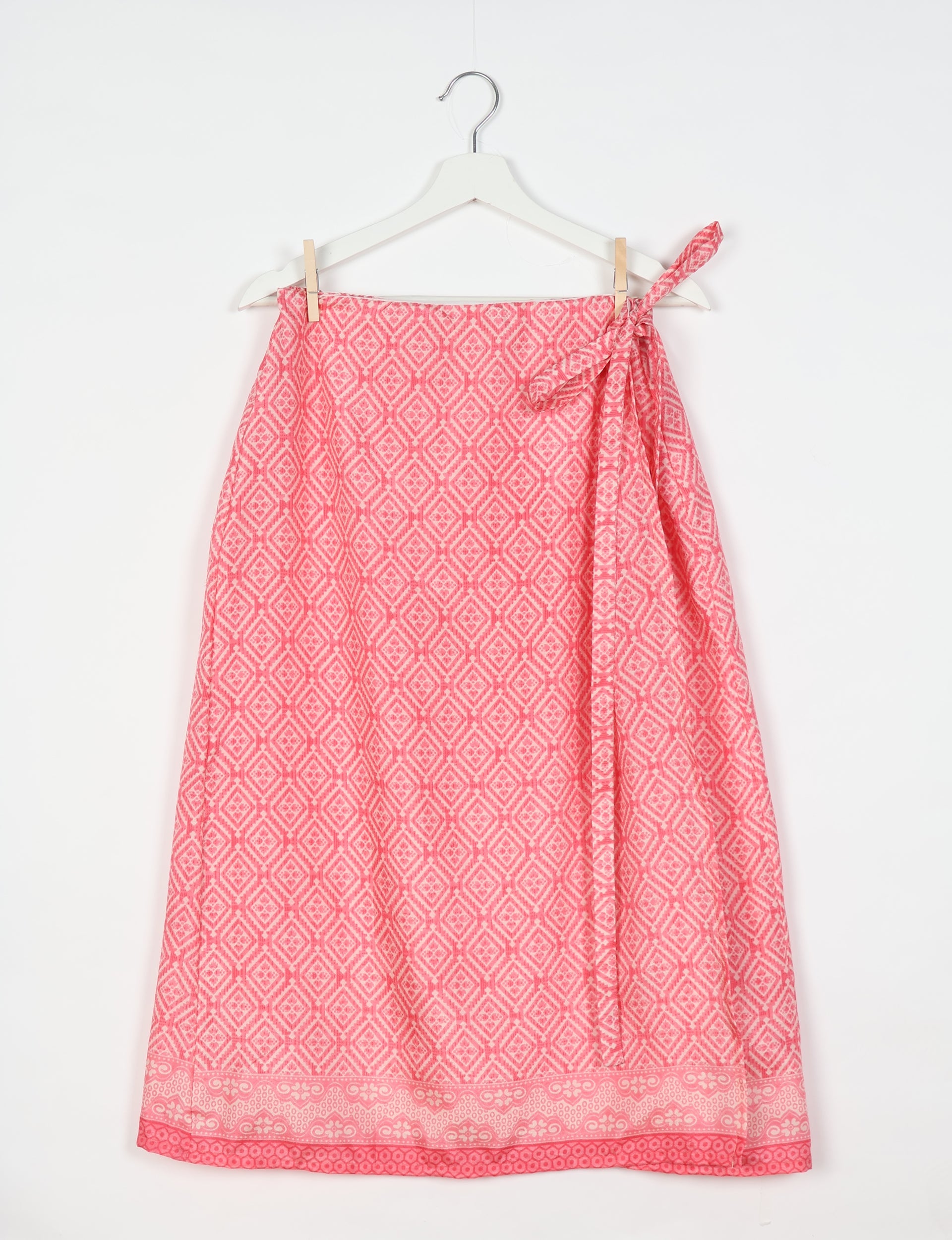 This is a midi length wrap skirt with an adjustable tie closure at the waist. The waistband is partially elasticated at the back for flexible sizing and added comfort. The wrap panel overlaps at the front and secures with a fabric tie at the side. The silhouette is straight with a gentle flare towards the hem.