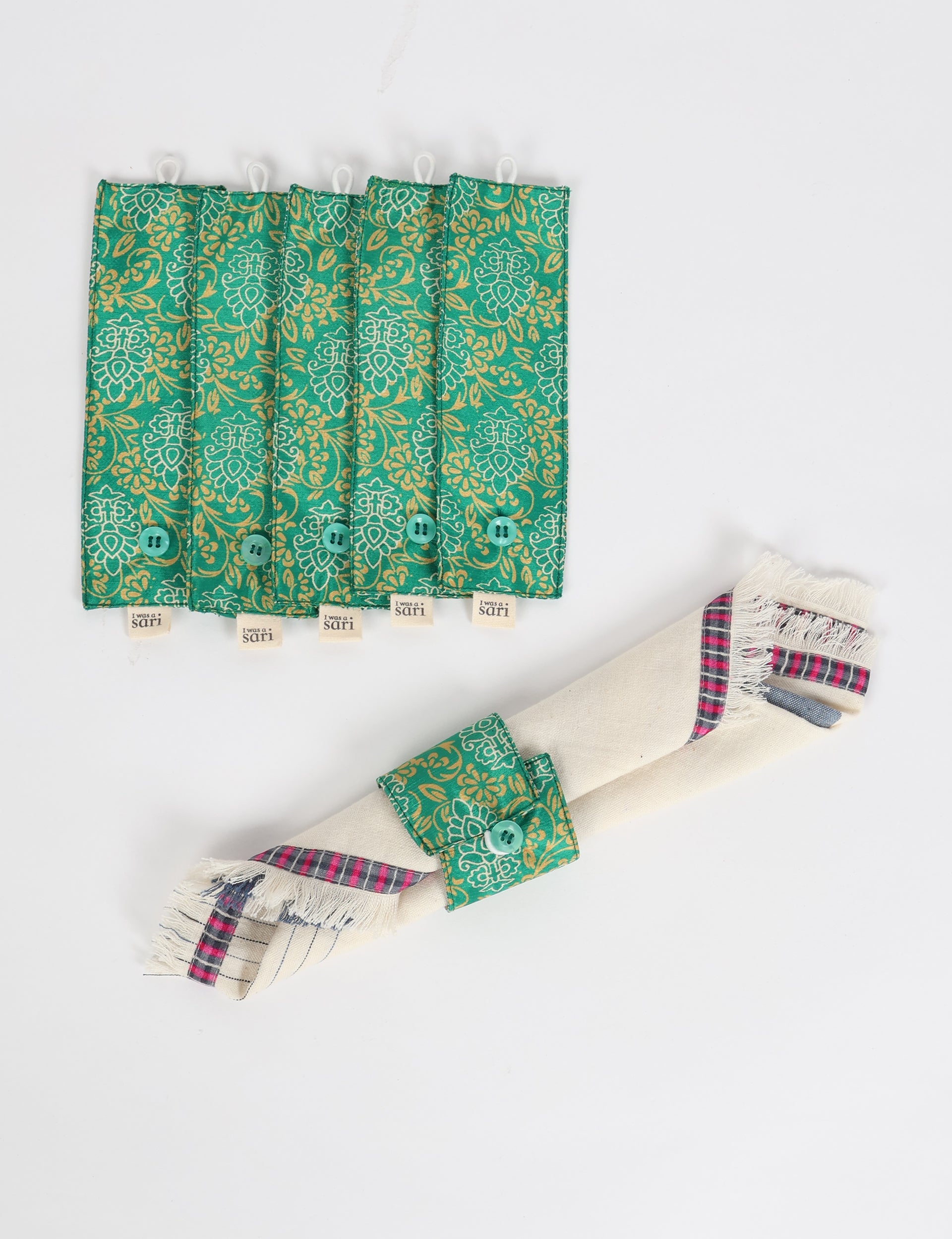 Set of six fabric napkin rings with button and elastic loop closure. Keeps napkins neatly in place and adds a refined element to table settings. Lighting and screens may cause slight variations in color appearance.