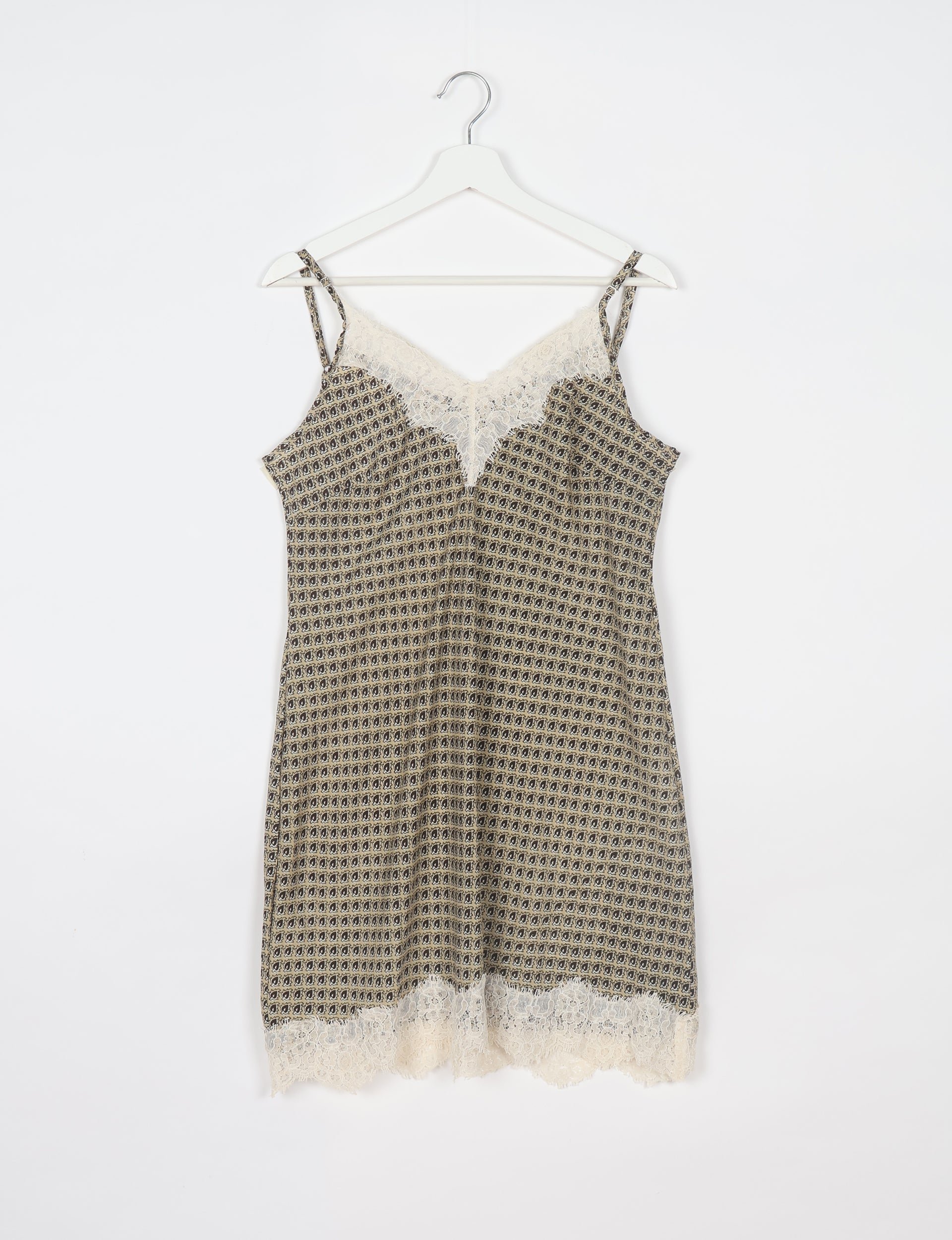 Sleeveless slip dress just falling above the knee with adjustable spaghetti straps. Features a scalloped lace insert at the neckline and a wide lace trim at the hem.