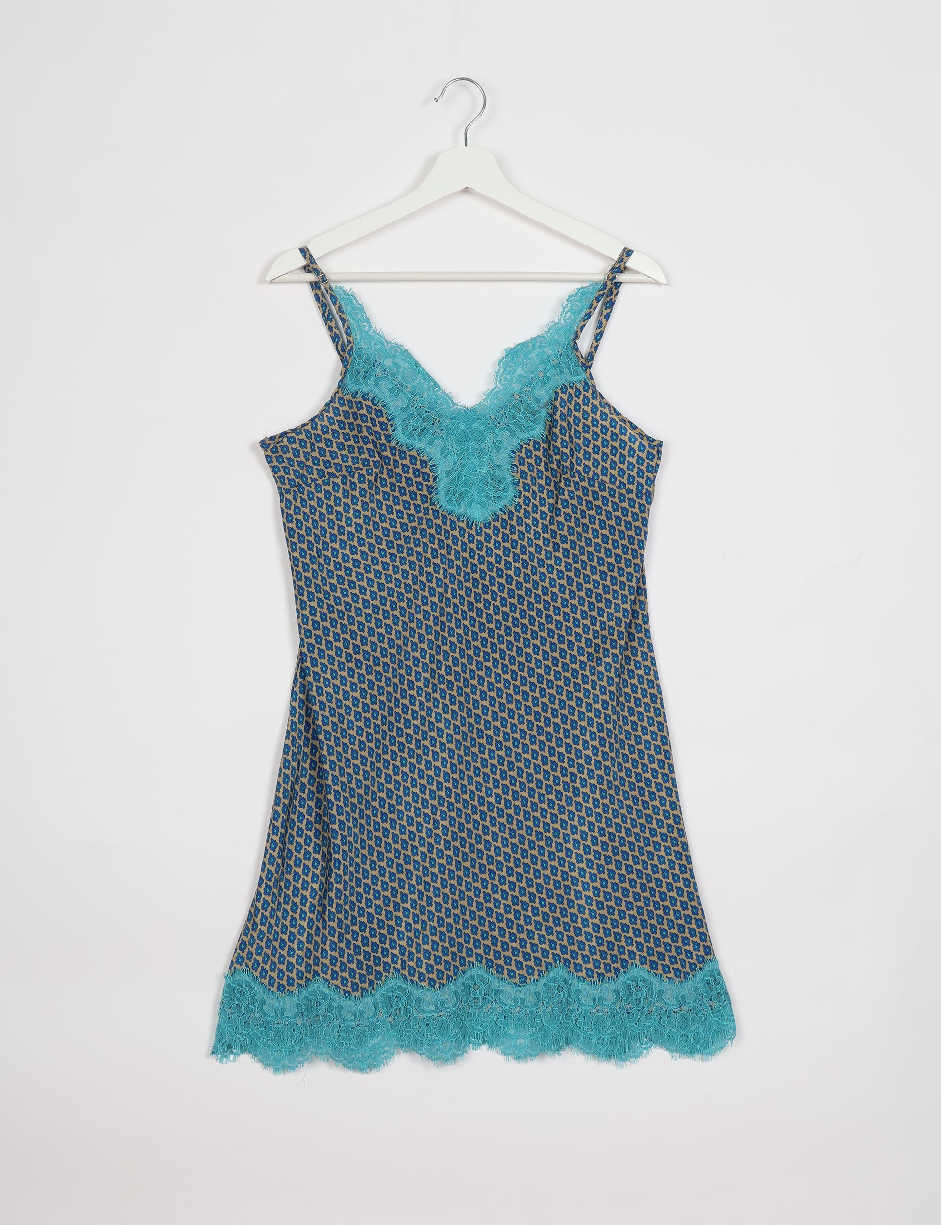 Sleeveless slip dress just falling above the knee with adjustable spaghetti straps. Features a scalloped lace insert at the neckline and a wide lace trim at the hem.