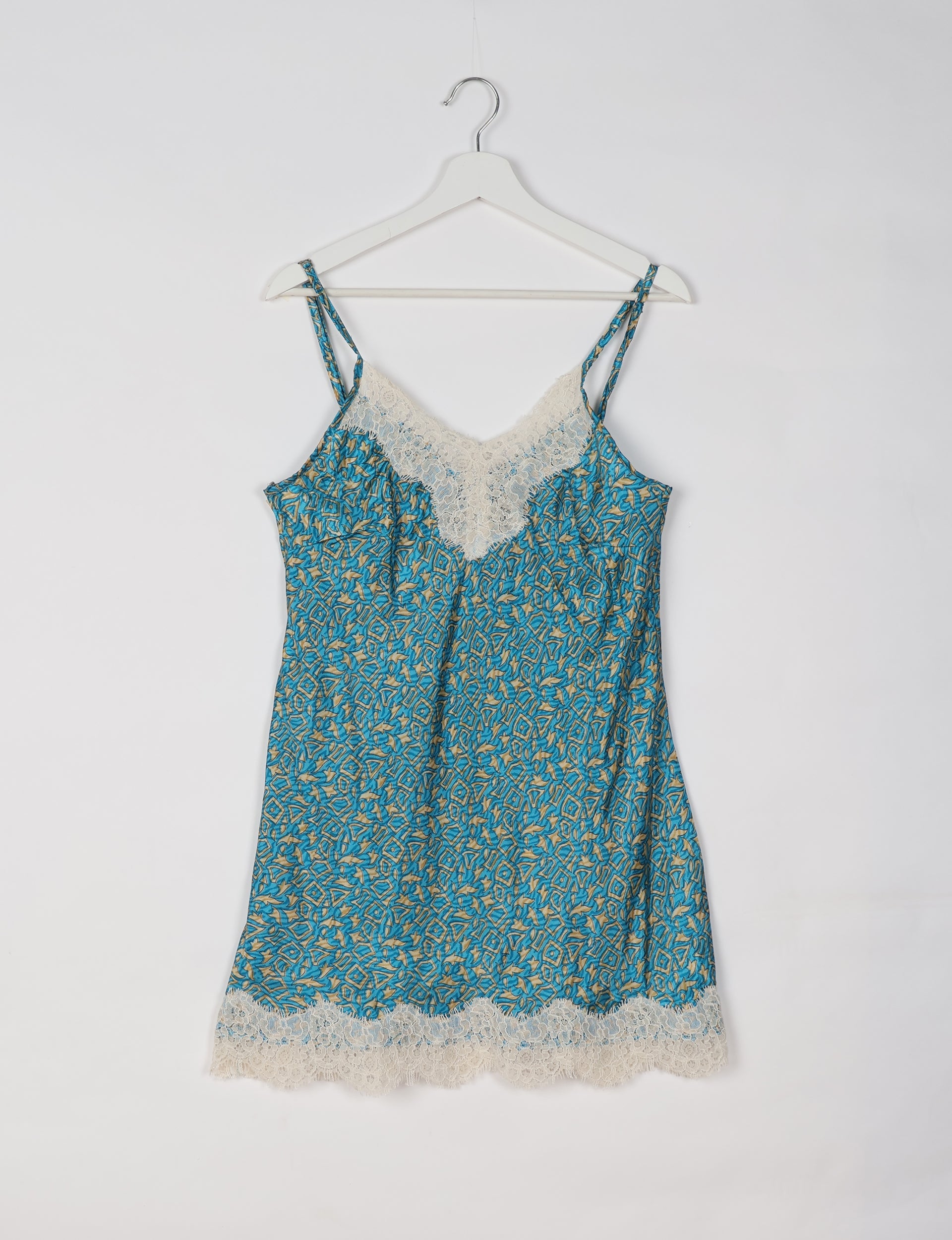 Sleeveless slip dress just falling above the knee with adjustable spaghetti straps. Features a scalloped lace insert at the neckline and a wide lace trim at the hem.